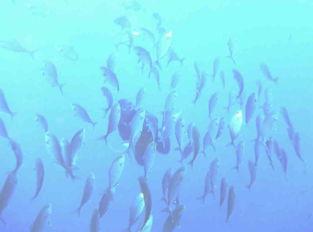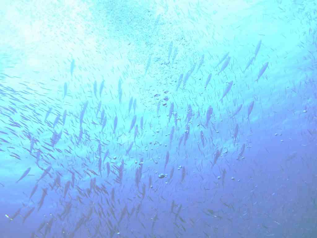 このキビナゴの数!!キビナゴの「壁」ができては消え、できては消え。そしてそこに、ツムブリの群れがぐるぐる!カンパチもぐるぐる!こちらのお写真をお貸しくださった「おとうさん」の周りを、ずーっとぐるぐると回っていました。「おとうさん」側から見ると、お写真からも伝わるように、群れ越しに同じチームのメンバーさんが見えています。みんな、楽しすぎて、しばし見とれてしまいました!
