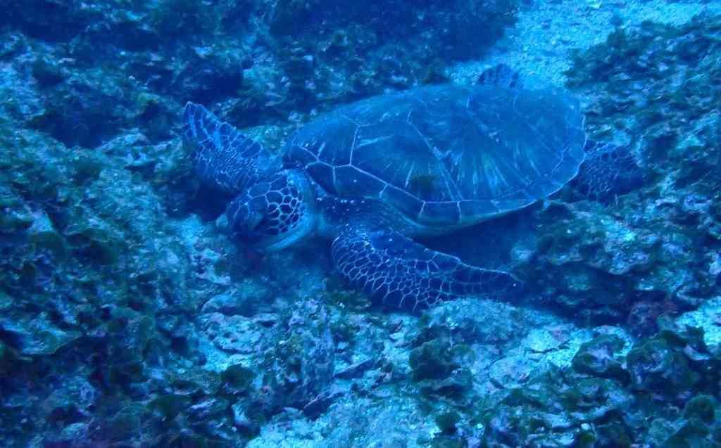 途中で出会ったアオウミガメは、ずーっと海草をムシャムシャと食べていました。お食事に夢中で、私たちのことにはお構いなし。台風で海が荒れる前に腹ごしらえ、といった感じなのかな。
