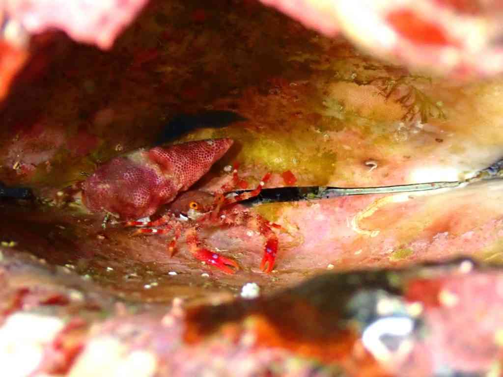 そして、貝の中に住んでいた、コシオリエビ属の仲間。こんな、指先の爪より小さなサイズの生き物にも、ちゃんと分類や名前があって、 研究がされているんですね~。あいにく、図鑑で探してみても、この子の名前は「コシオリエビ属の仲間」としかわからなかったですが、甲殻類の世界も奥が深くて面白いです。