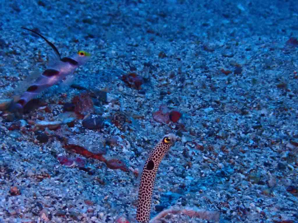 写真には写ってませんが、本当はこの奥にもう一匹チンアナゴが住んでいて、ヒレナガネジリンボウもペアでした。全部一緒に写せたら4匹!!チャレンジしたいなー!