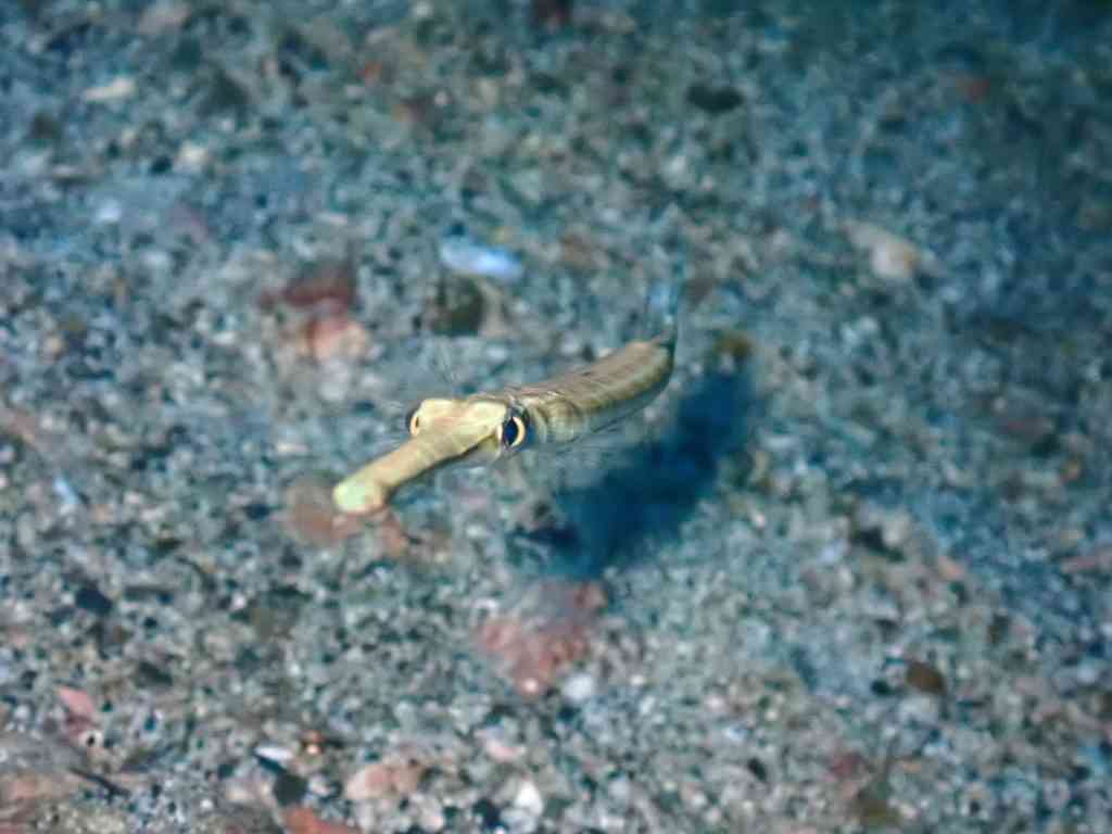 久々に行った深場の砂地で、アオヤガラの幼魚。お写真では伝わりにくいですが、ちょうど鉛筆ほどの大きさで、かわいかったです。