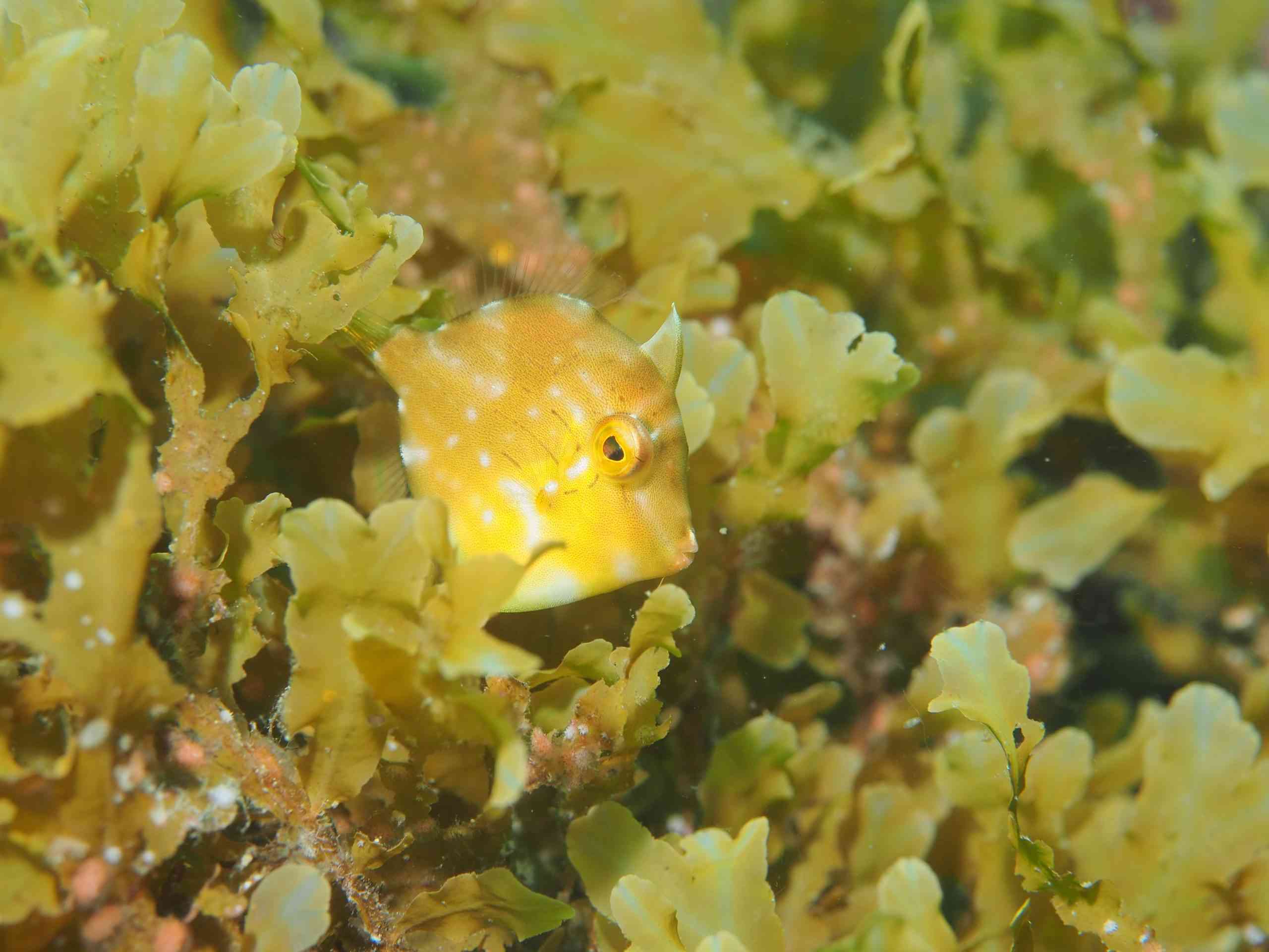 アオサハギ幼魚は海藻に埋もれてかくれんぼ。横目でチラ見が、かわいいです。