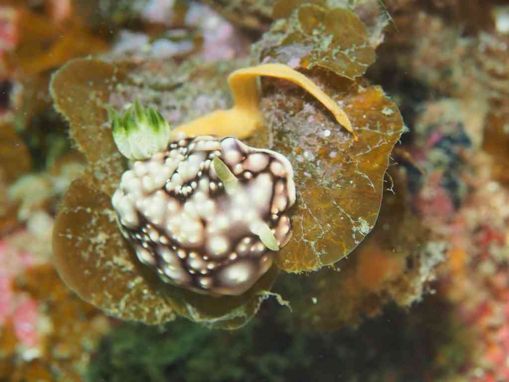キカモヨウウミウシ、産卵中。黄色い、ピロんと出ているのが卵塊。この後、どうやってクルクル模様になっていくのかな?ウミウシがクルクル回って産み付けていくのかな?その場合、既に生んだ卵を踏みつけていくことにならないのかな?最終形態がどうなるのか、是非見ていただきたいですね~!