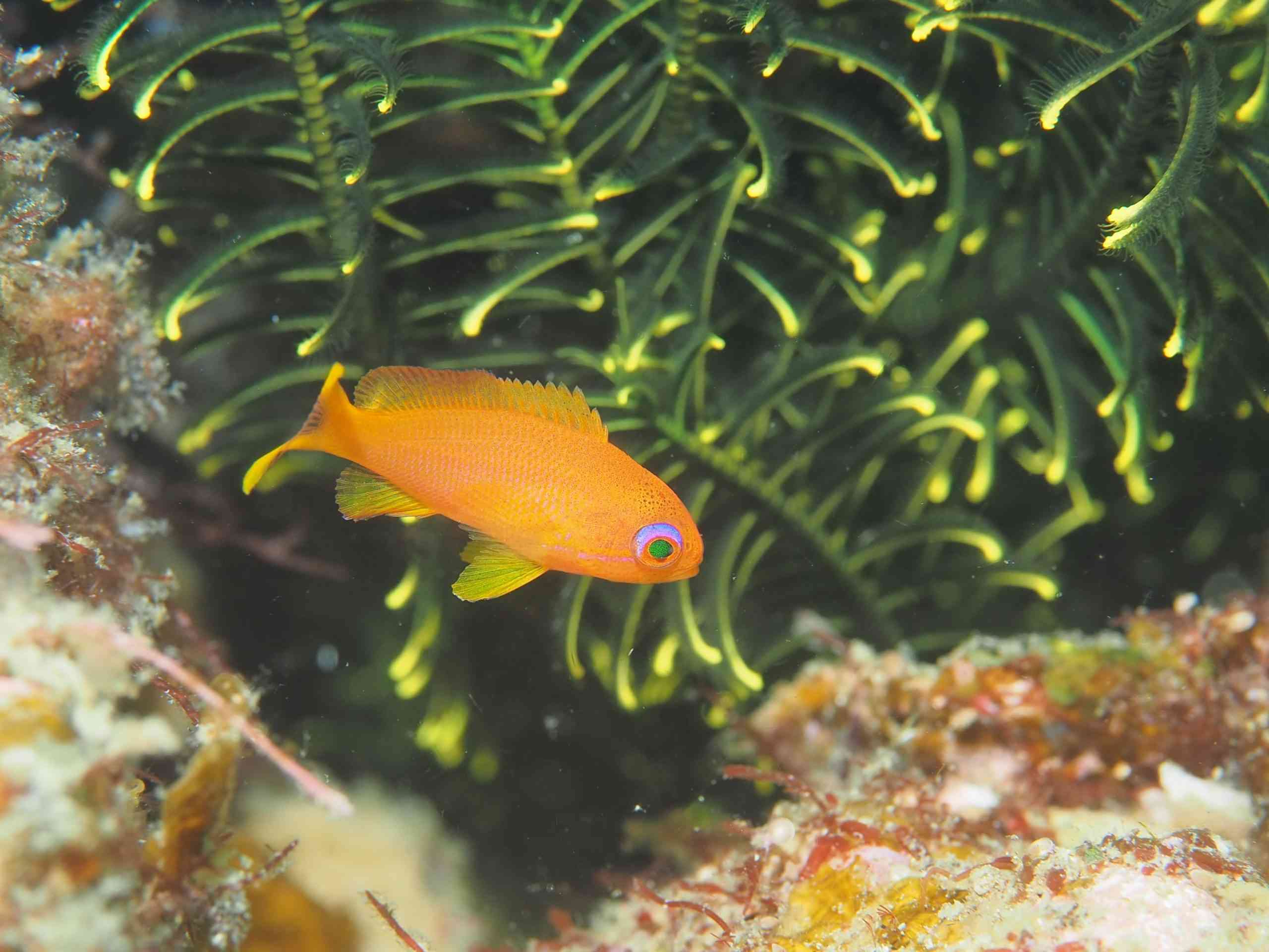 カゴカキダイ群れ、ネジリンボウ、ヒレナガネジリンボウ、ウミテング、アカゲカムリ、ミミック系タコ、コケギンポ、ガラスハゼ、ニシキヤッコ、イロカエルアンコウ、キカモヨウウミウシ、アオサハギ、イソコンペイトウガニ