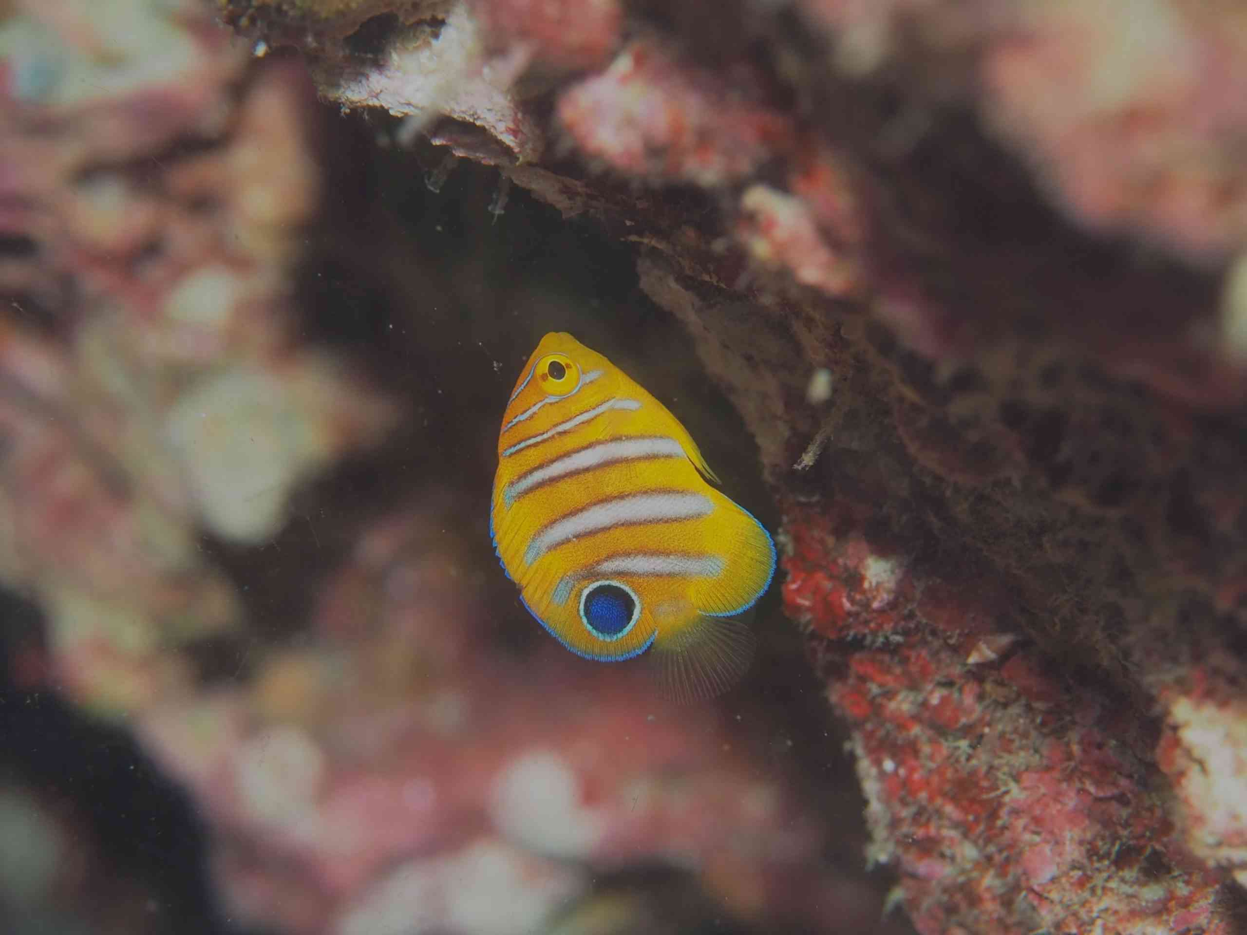 ニシキヤッコの幼魚もオシャレでキレイな色。どうしてこう、色彩センスのイケてる配色なんでしょう。オシャレやわぁ!