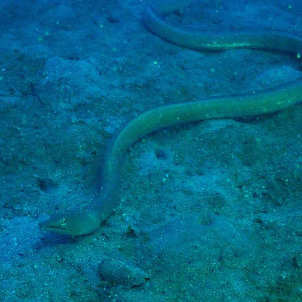 こちらは私の足元にからみついてきていた、ダイナンウミヘビ。猫がじゃれるように、私の足元にいたらしいです。本人まったく気づいておらず、教えてもらってびっくりしました!(笑)