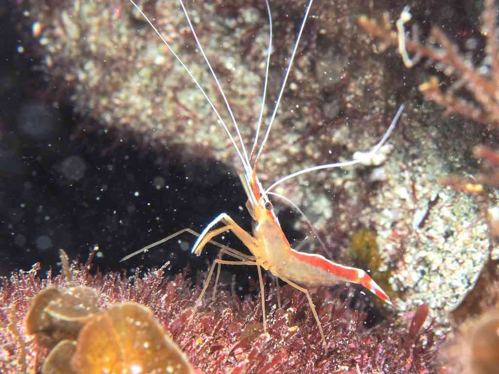 まずは、アカシマシラヒゲエビ、キレイな体色です。その名の通り、体に赤い縞、白いひげ、のエビちゃん。