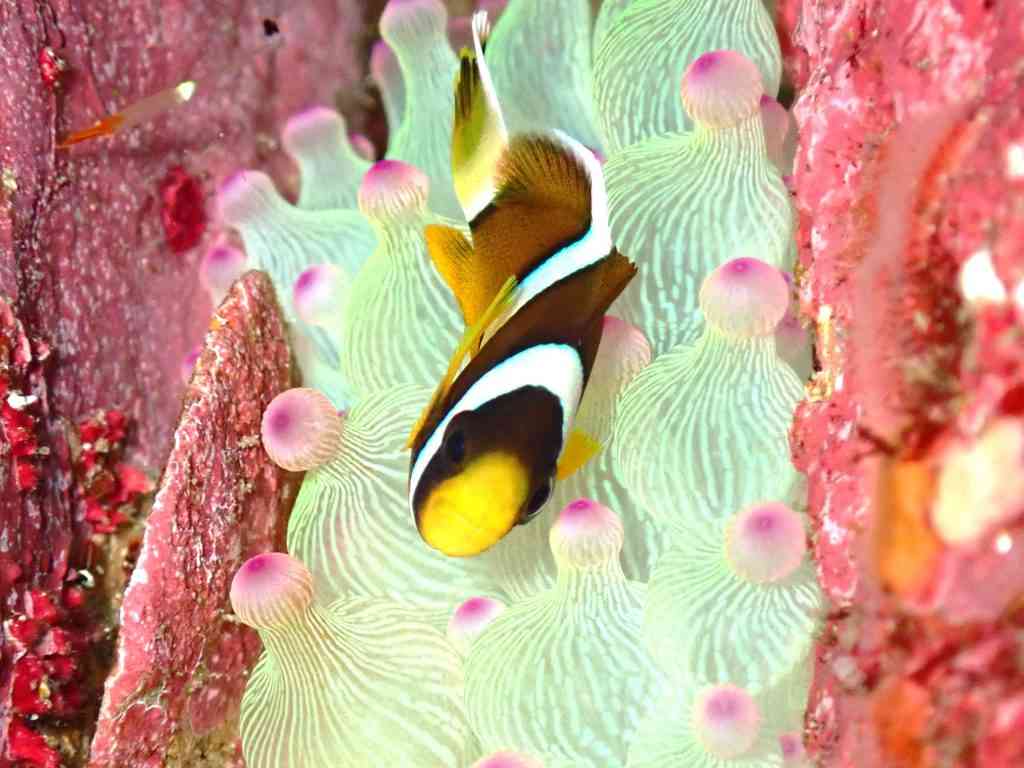 そして、白いイソギンチャクに住んでいた、クマノミの子ども。小さい体を震わせるように、寒い海中を生き延びています。頑張って!!