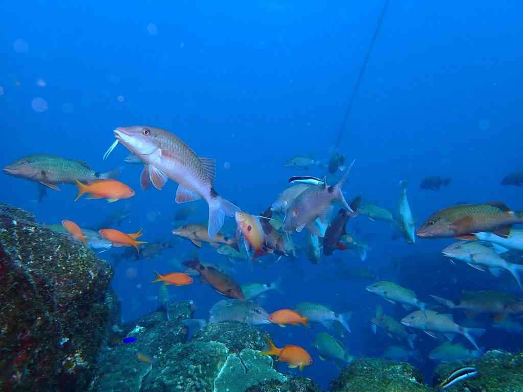 最後は、ホウライヒメジと、オレンジ色が鮮やかなキンギョハナダイ。遠くまでずらっと群れているホウライヒメジは、いつ見ても「おおおー!」ってなります。冬の風物詩。なぜここに集まりボーッと過ごしているのかはわかりません。それぞれ、クリーニングしてもらったり、時々ご飯探してたり、まれに求愛してたり(そしてほぼフラれている)、思い思いに過ごしている魚たちです。