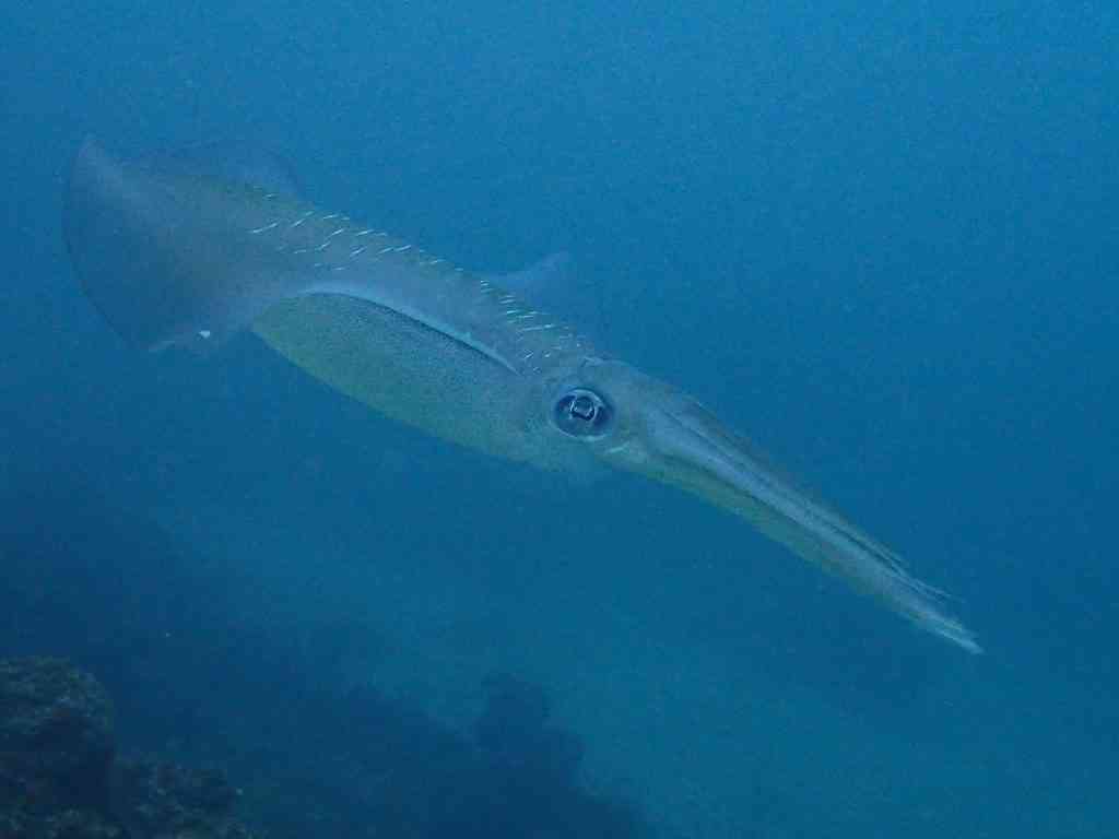おおお!!産卵床をまったく有効活用してくれていない、アオリイカと遭遇。まだまだ本気の産卵モードじゃなかったので、すぐに泳いで行ってしまいましたが、ちゃんと相方のメスをエスコートして泳いでました。すぐ近くには、これまた大きなオスがいましたが、ペアの方のオスの威嚇を受けて、一撃で負けてどこかへ逃げていきました。