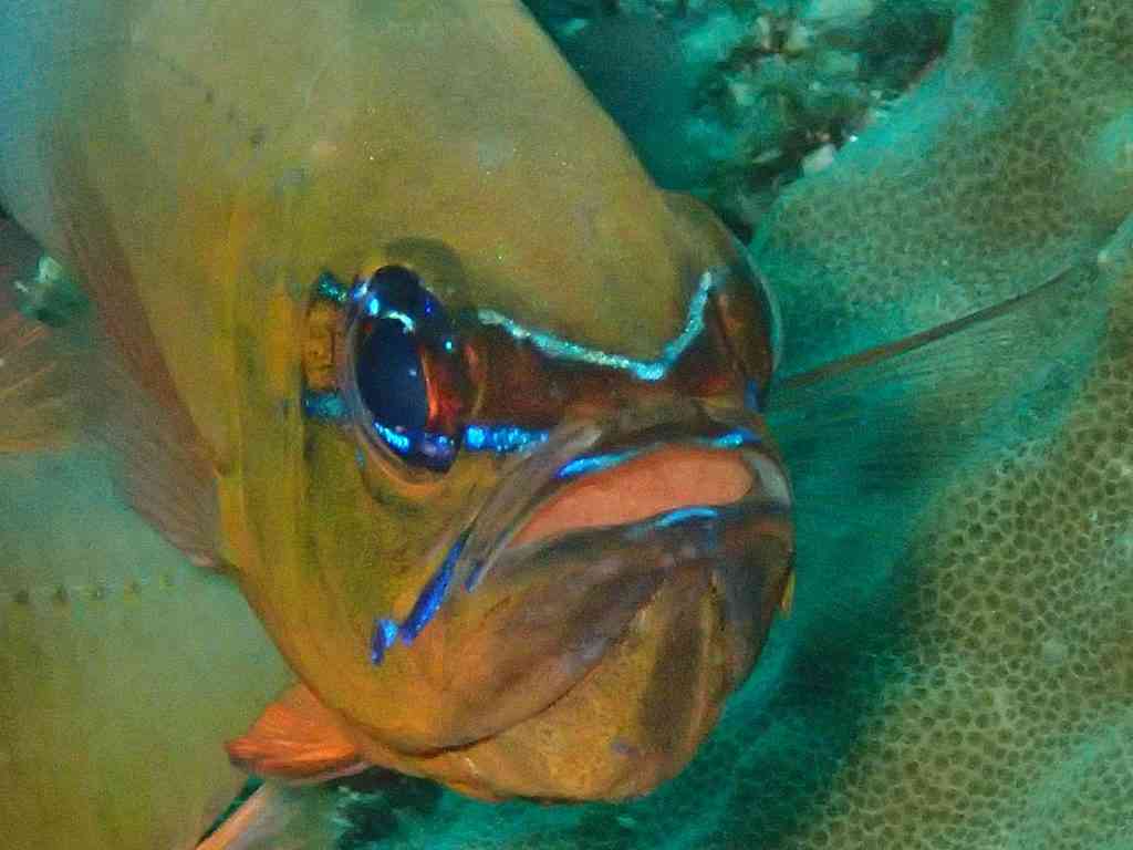 そして、口内保育中の、アオスジテンジクダイ。口の中にオレンジ色の小さな小さな卵が見えます☆元気に育ってね~!