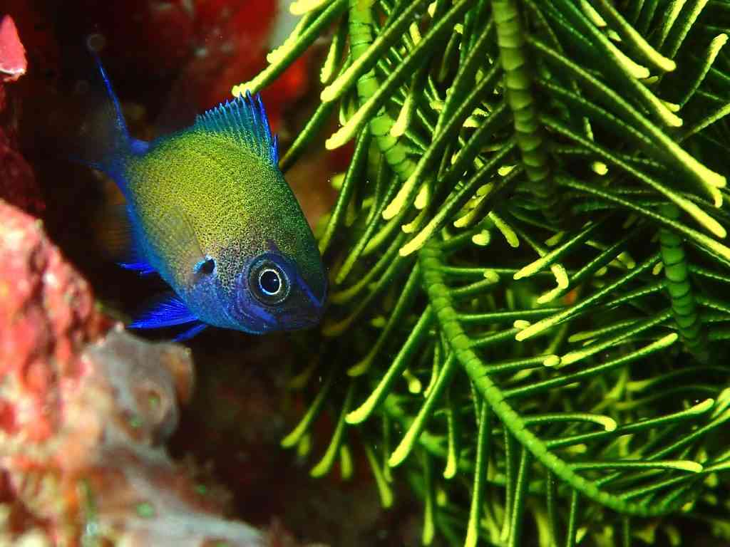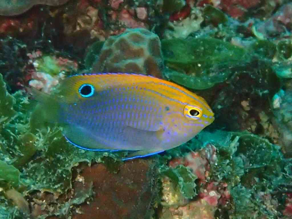 そして、クロメガネスズメダイ幼魚。キレイな色合いのオシャレさん。黄色と水色って合うよね~!!