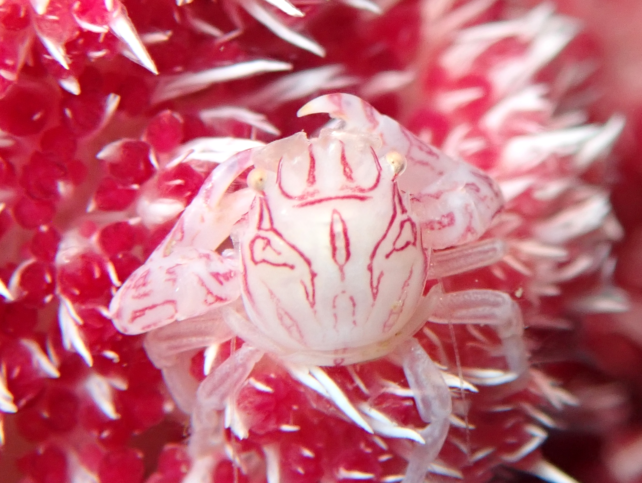 こちらはアミメベニサンゴガニ。シマシマの模様がオシャレなんです。