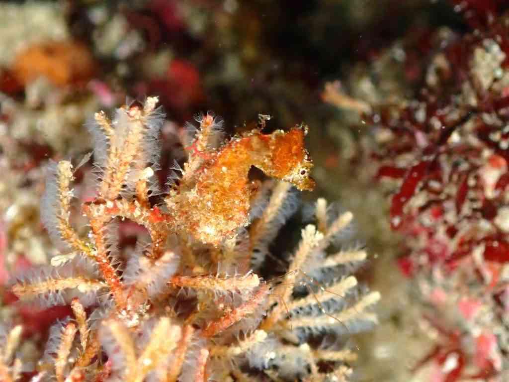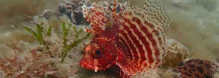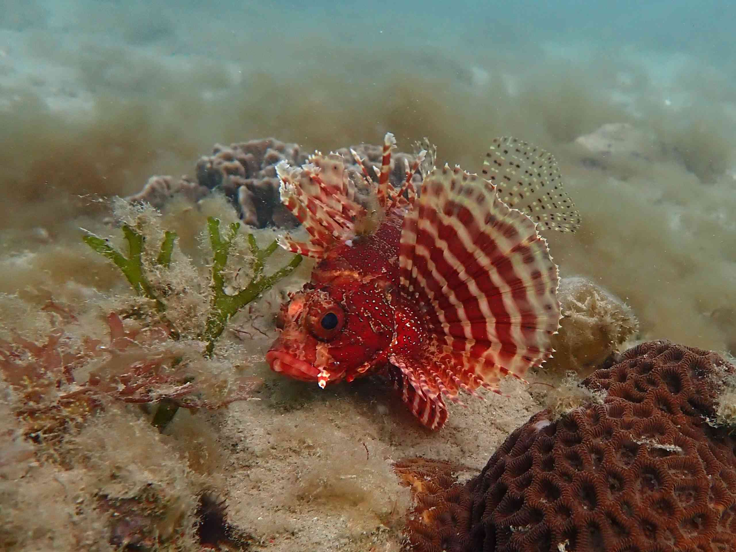 午後は、「住崎方面がダメだったらサンビラ行きましょう!」と皆が出港したのを見送ったのに、わずか20分ほどで、店裏で、うちの船の「ブルンブルン、ブルルルルルン!」と轟くエンジン音。ボートでこのまま沖の方のポイントへ行くのは危険との判断。船の帰り道、ビーチでゲスト様とガイドを降ろして船だけ帰ってきたそう。そんな皆さんの2ダイブ目は、なんとビーチを大冒険、あちらこちらで色々な生物を見て帰ってきたそうです~。それでこちら、ヒレがシマシマ、派手な子。シマヒメヤマノカミ・・・・・・・・・ねぇ、皆さん、もう一回、復唱してみて?言えないですよね、舌を嚙みそうな名前!(笑)