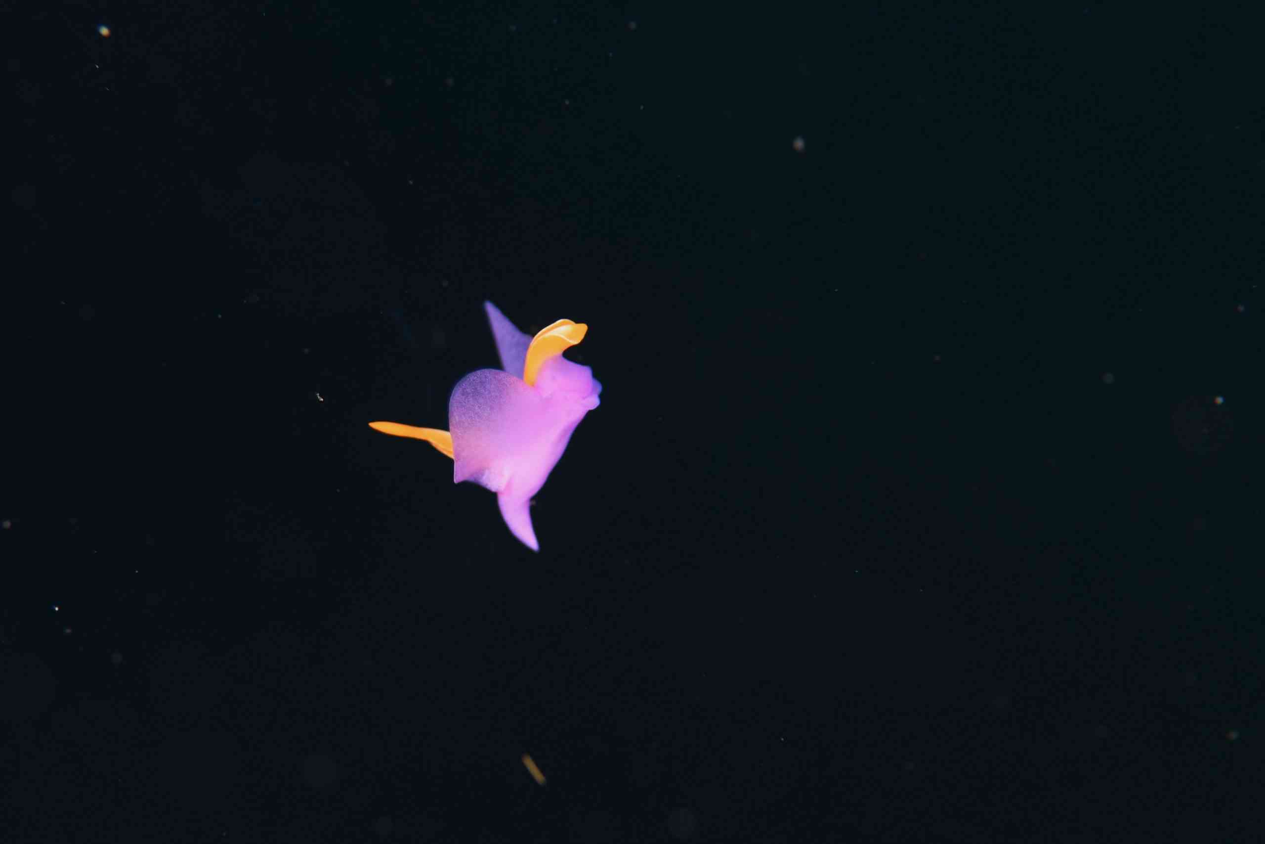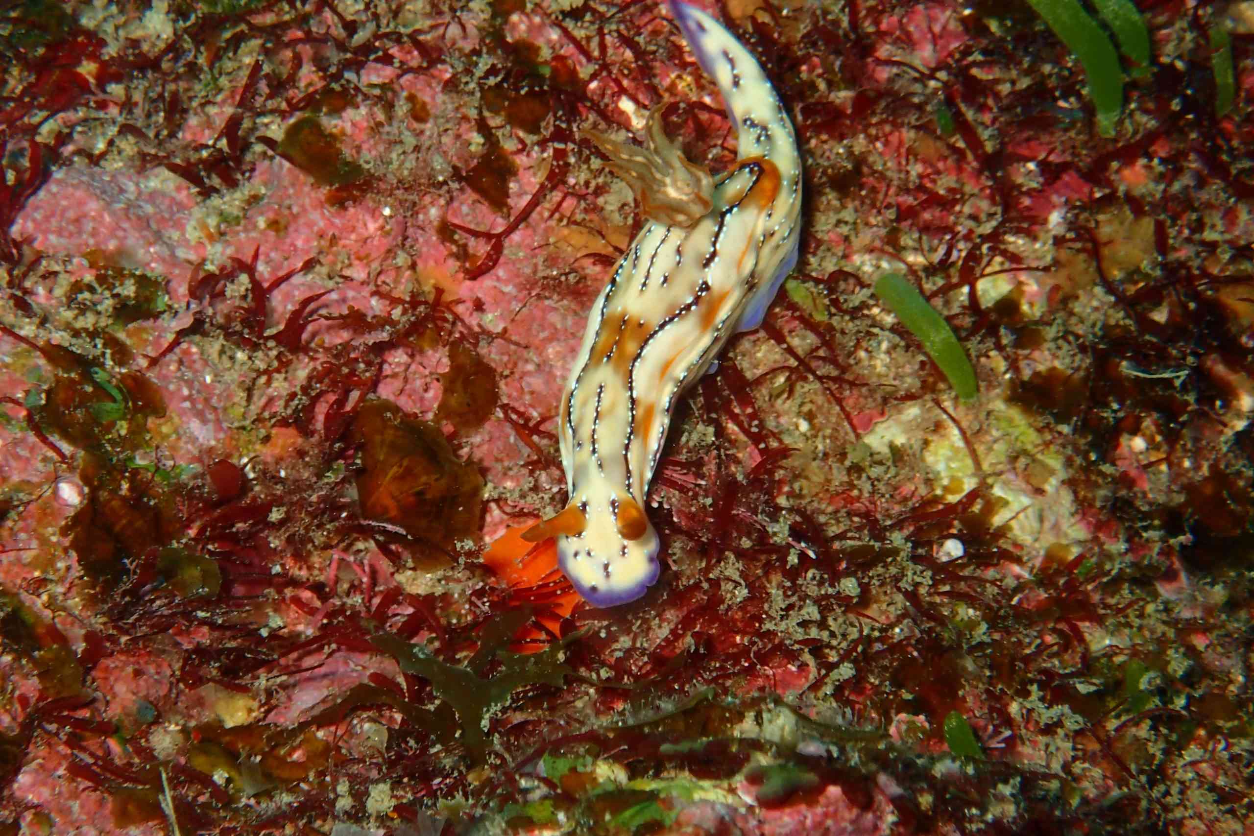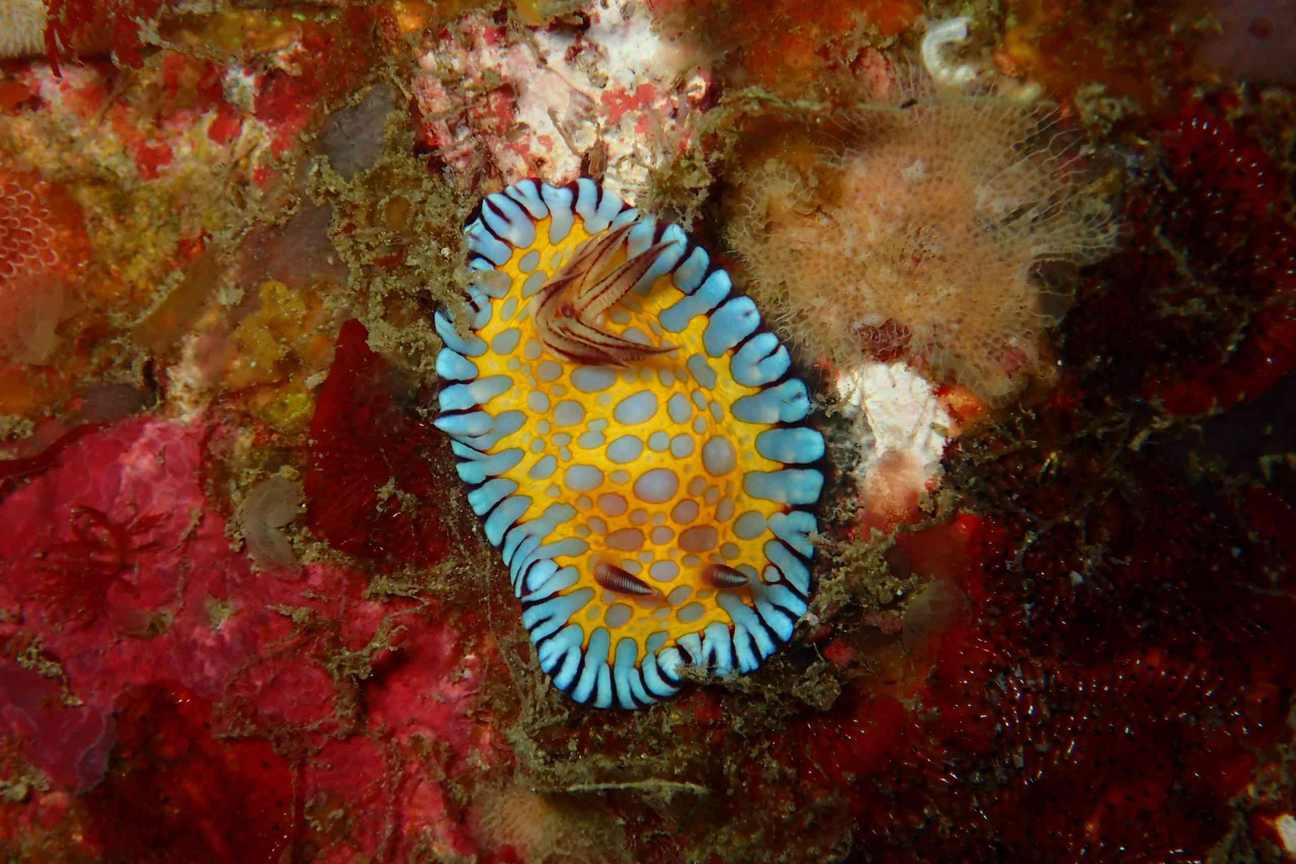 生き物のお写真は、やいちゃんさんからお借りしました。まずは、ウミウシ界の、個人的No.1アイドル、ゾウゲイロウミウシ。真っ白でありながら、真っ白でない、この透き通るような美しい色。ふちに向かってわずかに見える薄紫の色彩と、黄色とピンクの触覚&二次鰓(エラ)。たまたま通りがかったところの下にいました!明日も会えたら、ぜひ皆さんにご紹介したいです。