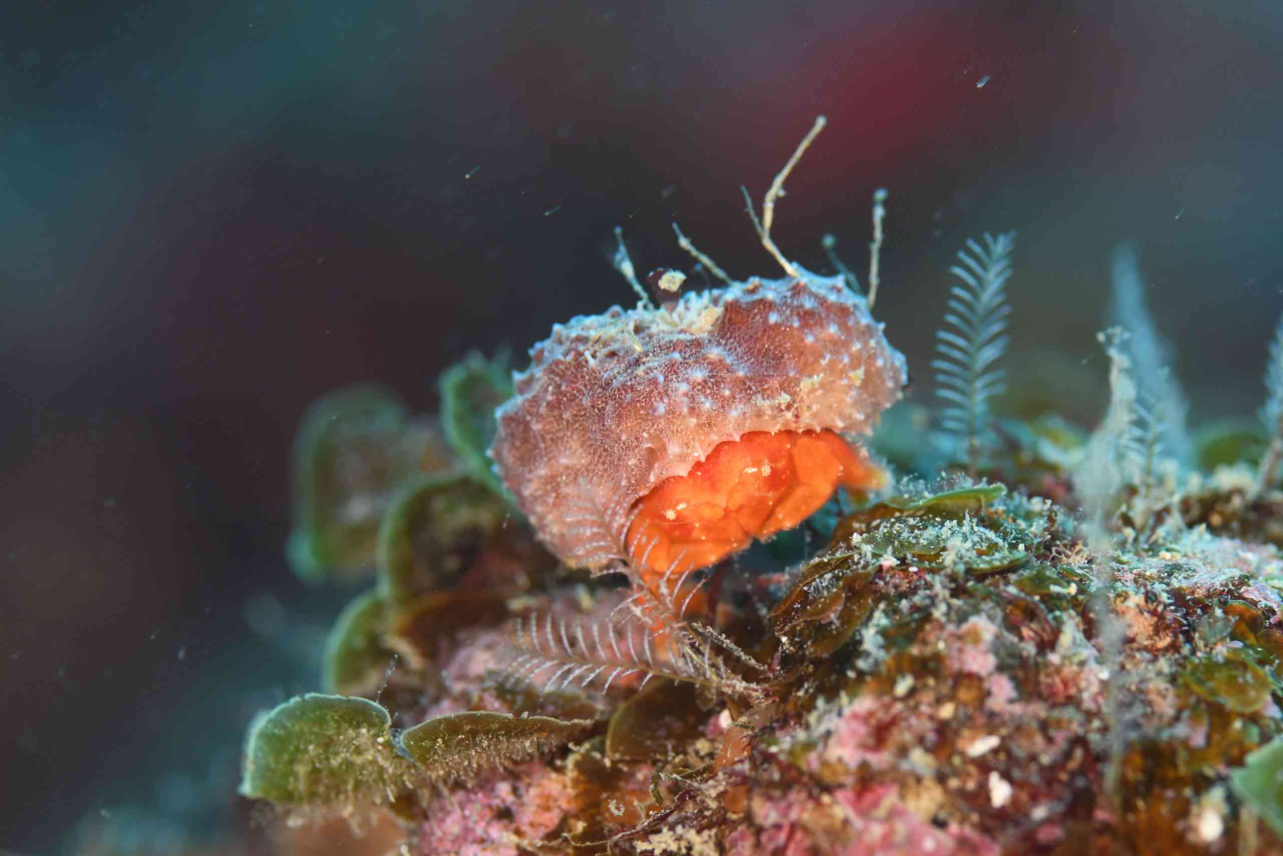 ピカチュウこと、ウデフリツノザヤウミウシは、交接を始めたところを撮っていただきました。お互いの体の右側から、交接器を出し、くっつけあっています。ウミウシって、食べるか、交接するか、産卵するか、しか脳がないと聞いたことがありますが、「なんて平和な生き方なんだ・・・!」と、ある意味尊敬です。攻撃したり、いじめたり、けんかしたり、そういうことがないのが、どれだけ幸せな生き方か。「おい、お前ばっかり交接してずるいぞ!」「おいおい、ここのコケムシ(ごはん)は全部オレのやぞ、お前はどっか行け!」とか、そういうことすら、有るのか無いのか・・・そもそも雌雄同体なので、「俺」とかいう概念も無いのか!不思議な生き物です。