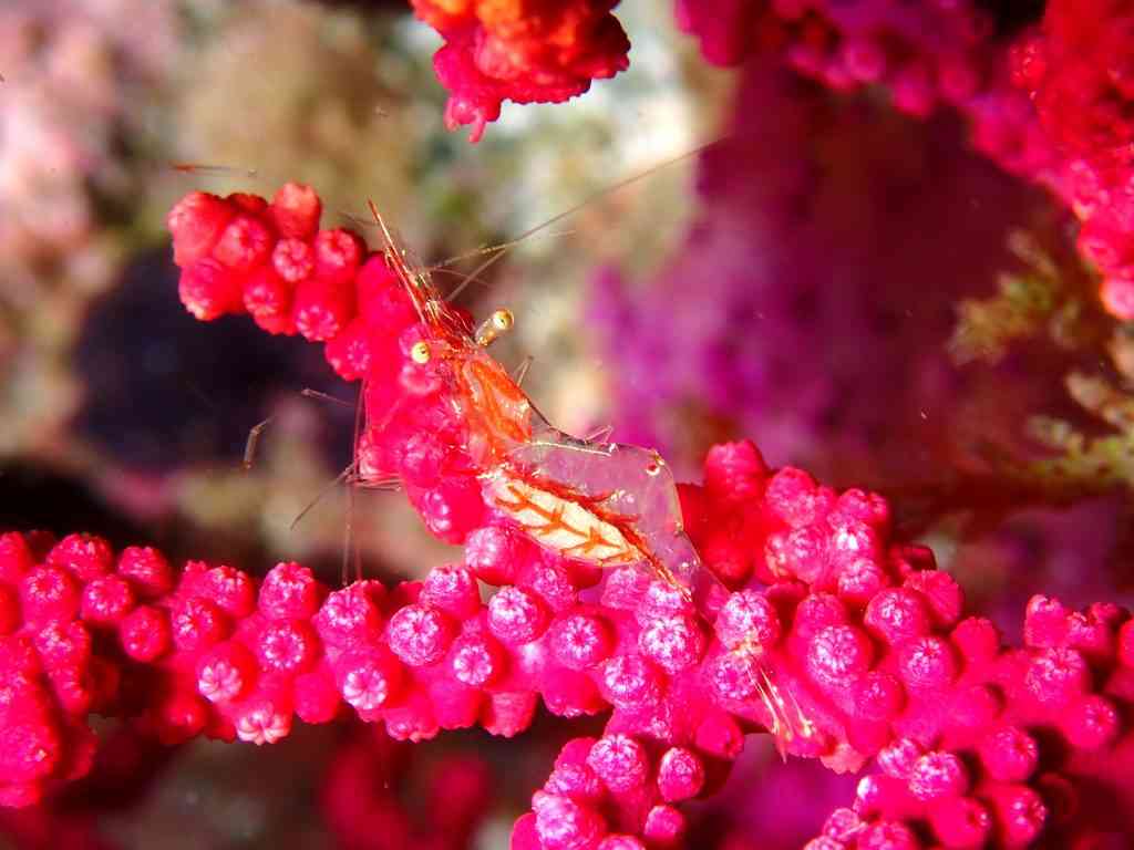そして、美しいおうちにお住まいのアカスジカクレエビ抱卵中。おなかの白っぽい卵が目立ちます。実際は透明のエビなので、見つけるのもお写真撮っていただくのも、ちょっと大変です。