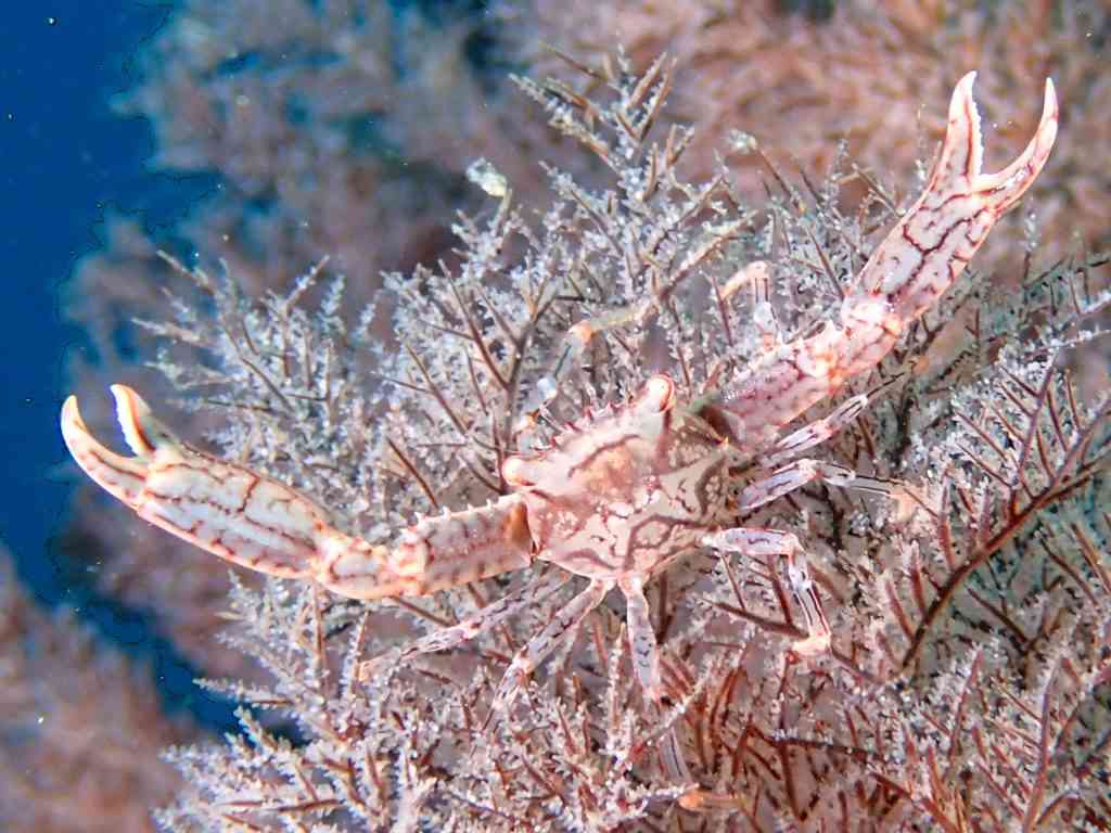 こちらはアミメベニサンゴガニ。シマシマの模様がオシャレなんです。