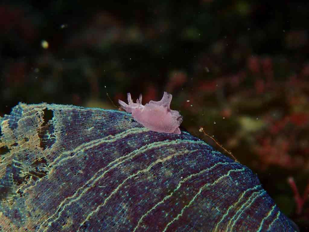 生き物のお写真は、やいちゃんさんからお借りしました。まずは、ウミウシ界の、個人的No.1アイドル、ゾウゲイロウミウシ。真っ白でありながら、真っ白でない、この透き通るような美しい色。ふちに向かってわずかに見える薄紫の色彩と、黄色とピンクの触覚&二次鰓(エラ)。たまたま通りがかったところの下にいました!明日も会えたら、ぜひ皆さんにご紹介したいです。