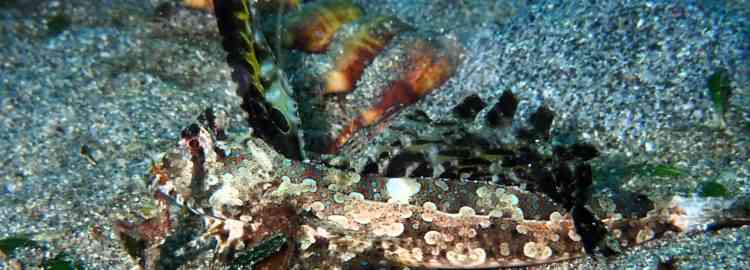 写真を撮っている間にも、行ったり来たり。もぞもぞとよく動いています。明日にはもう見つからないかもな~(;^ω^) しかもどんどん深い方へ移動していたので、見たい方はナイトロックスタンクの使用を推奨します。お写真は、そんな貴重なボロカサゴの正面顔。