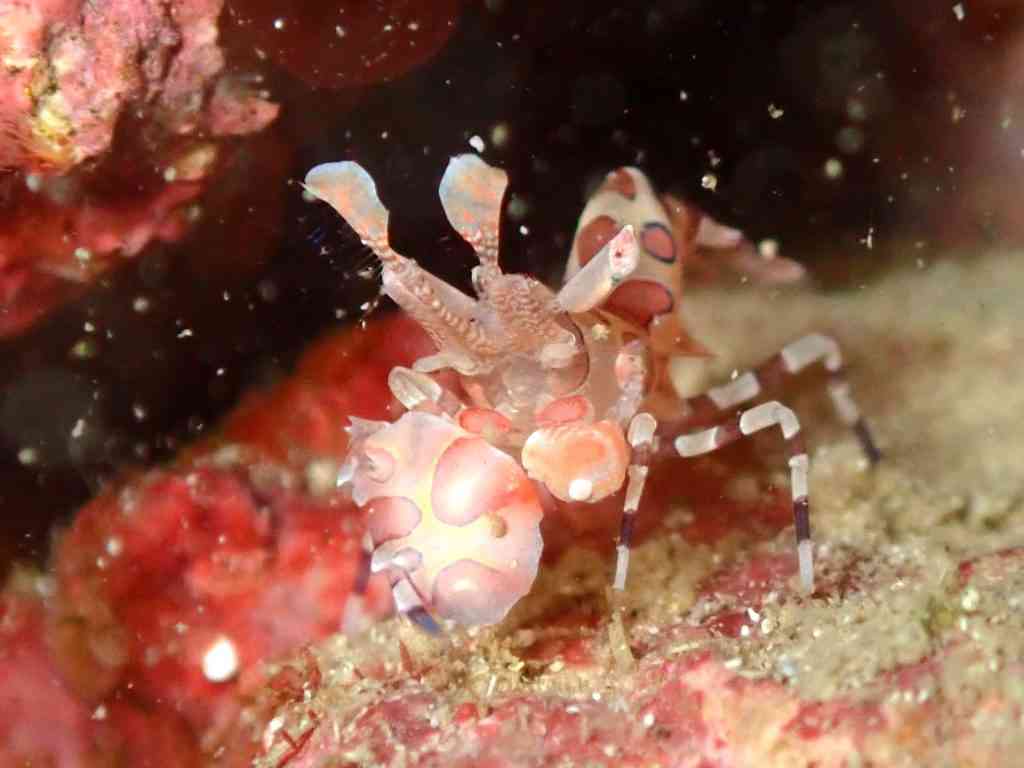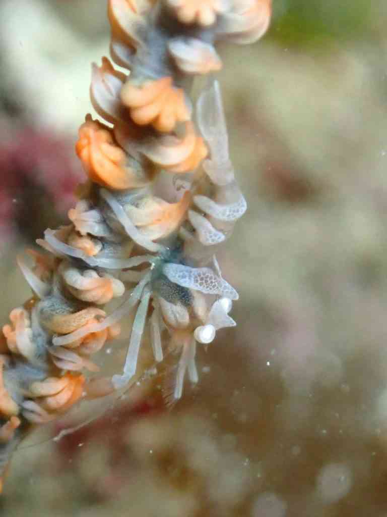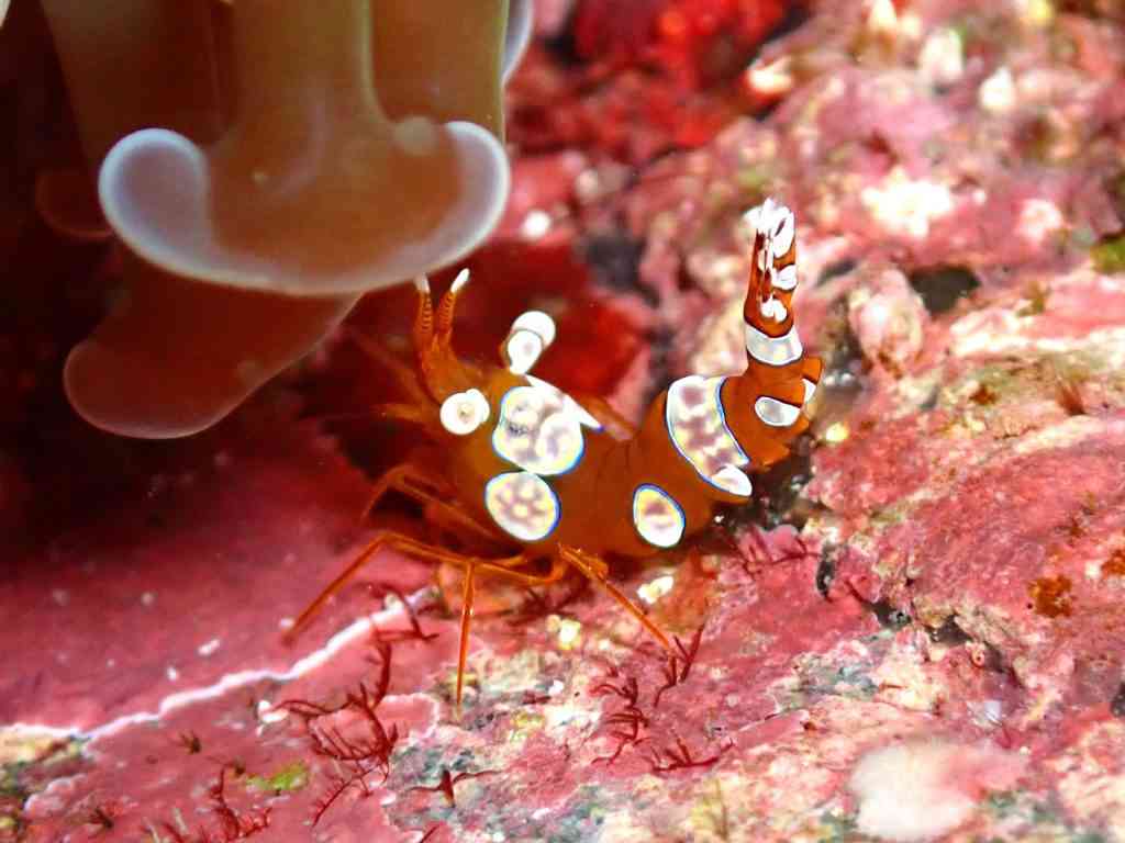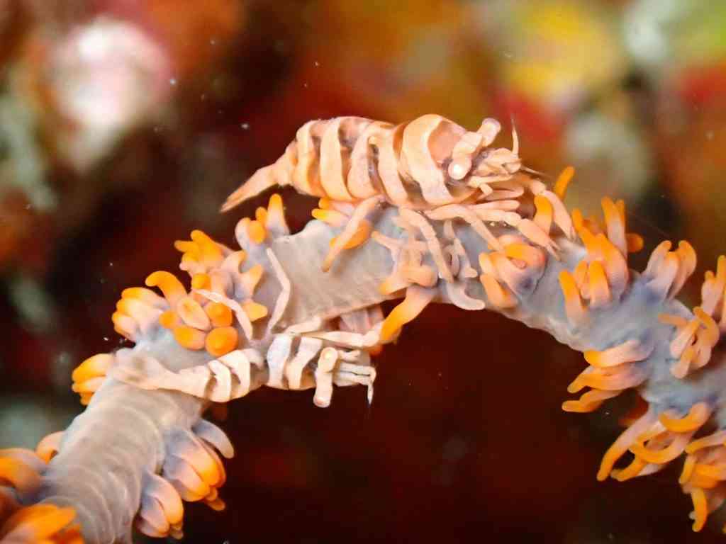 そして、イソギンチャクモエビ。鮮やかなオレンジ色と白色の子。体に入る模様まで、しっかり写ってます。