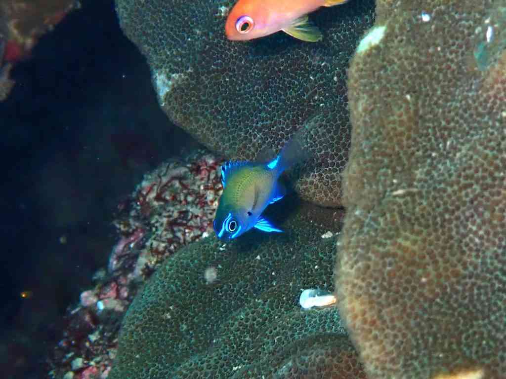 お次はアマミスズメダイの幼魚。目の上の青いきれいなラインが、かわいいです。まだまだ小さく1.5~2.0センチくらいです。