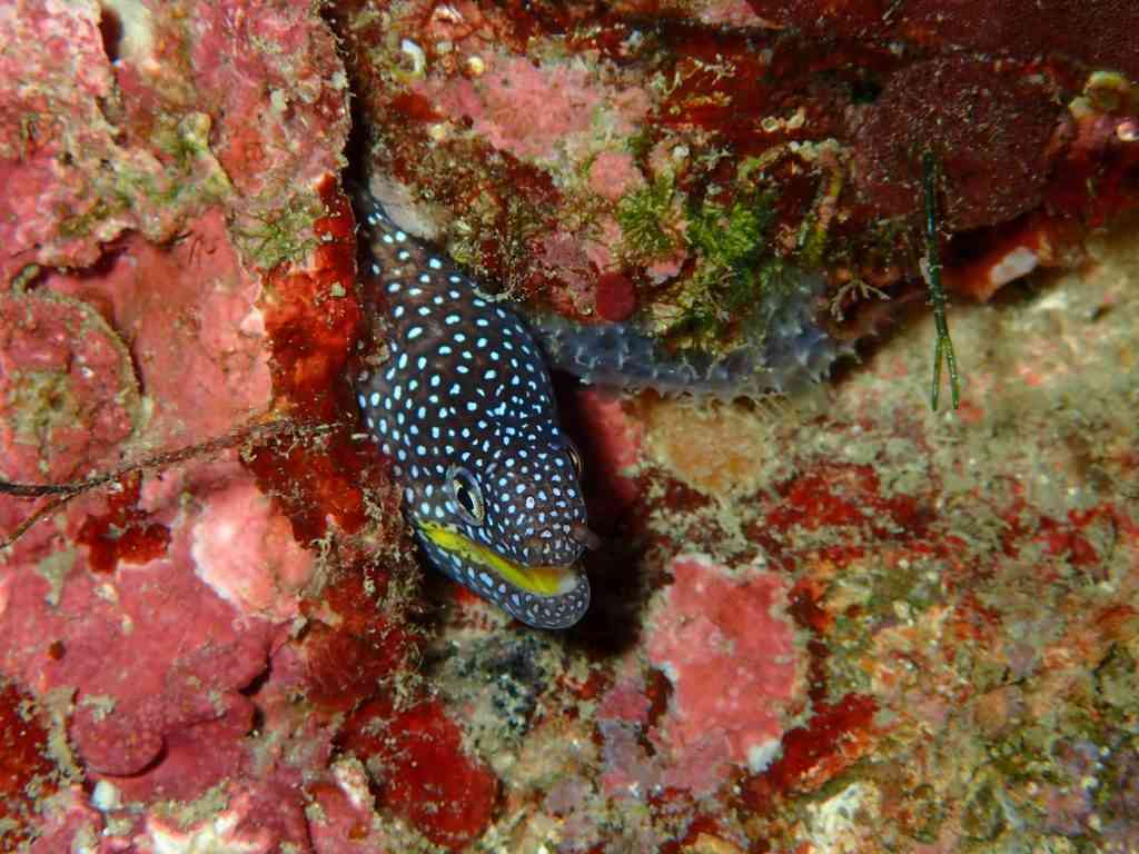 アデウツボは、茶色のような灰色のような、グレージュっぽいような色の体に白いドット柄。お口の中まで、黄色です。