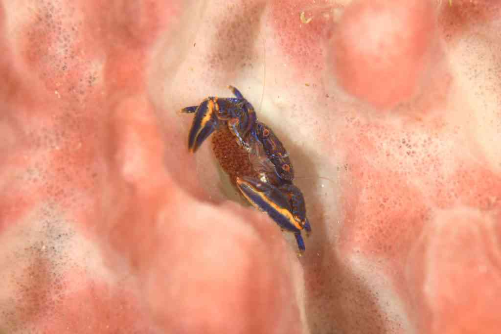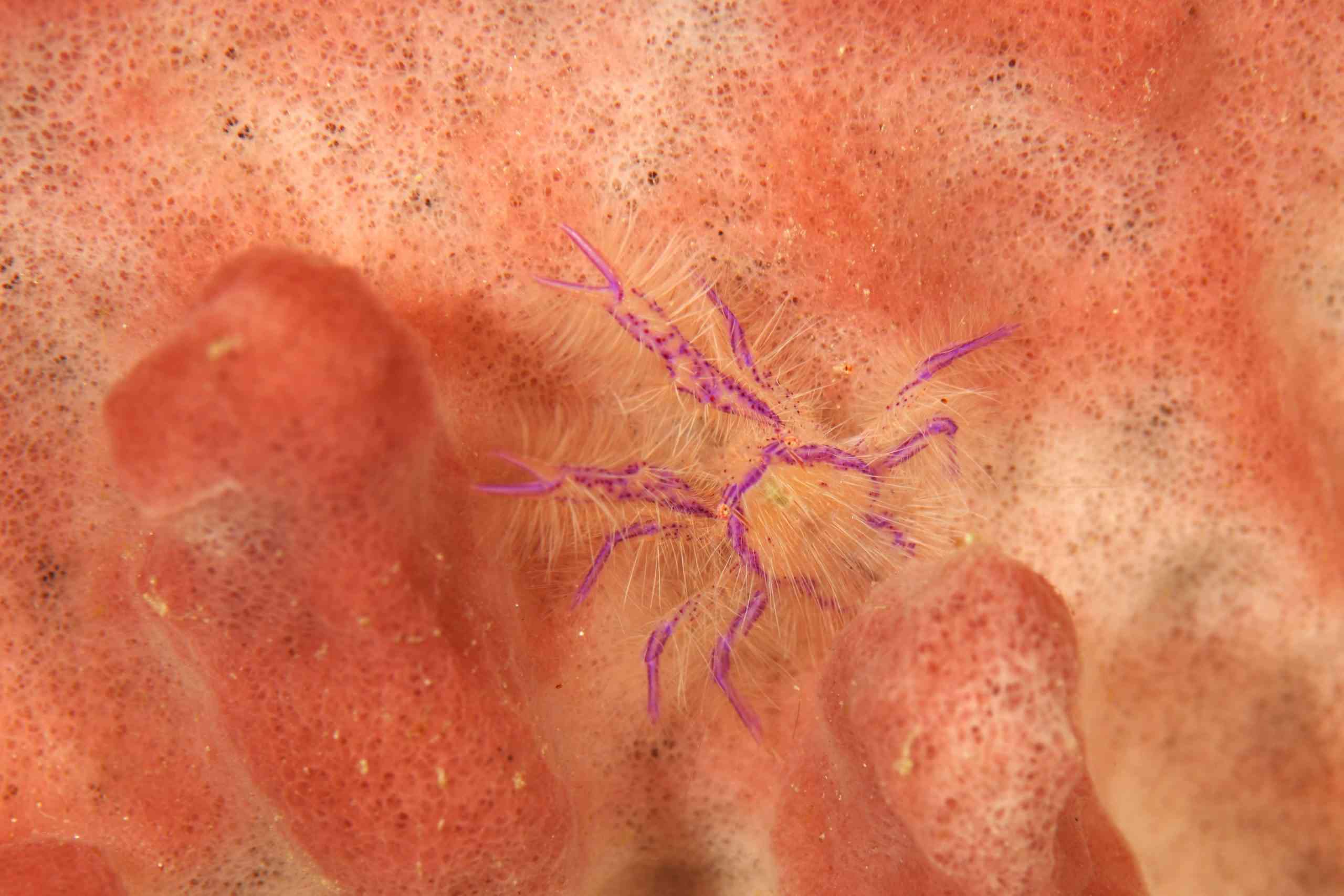 同じく、カイメンに住んでいる、チュウコシオリエビ。毛がフサフサですね~。