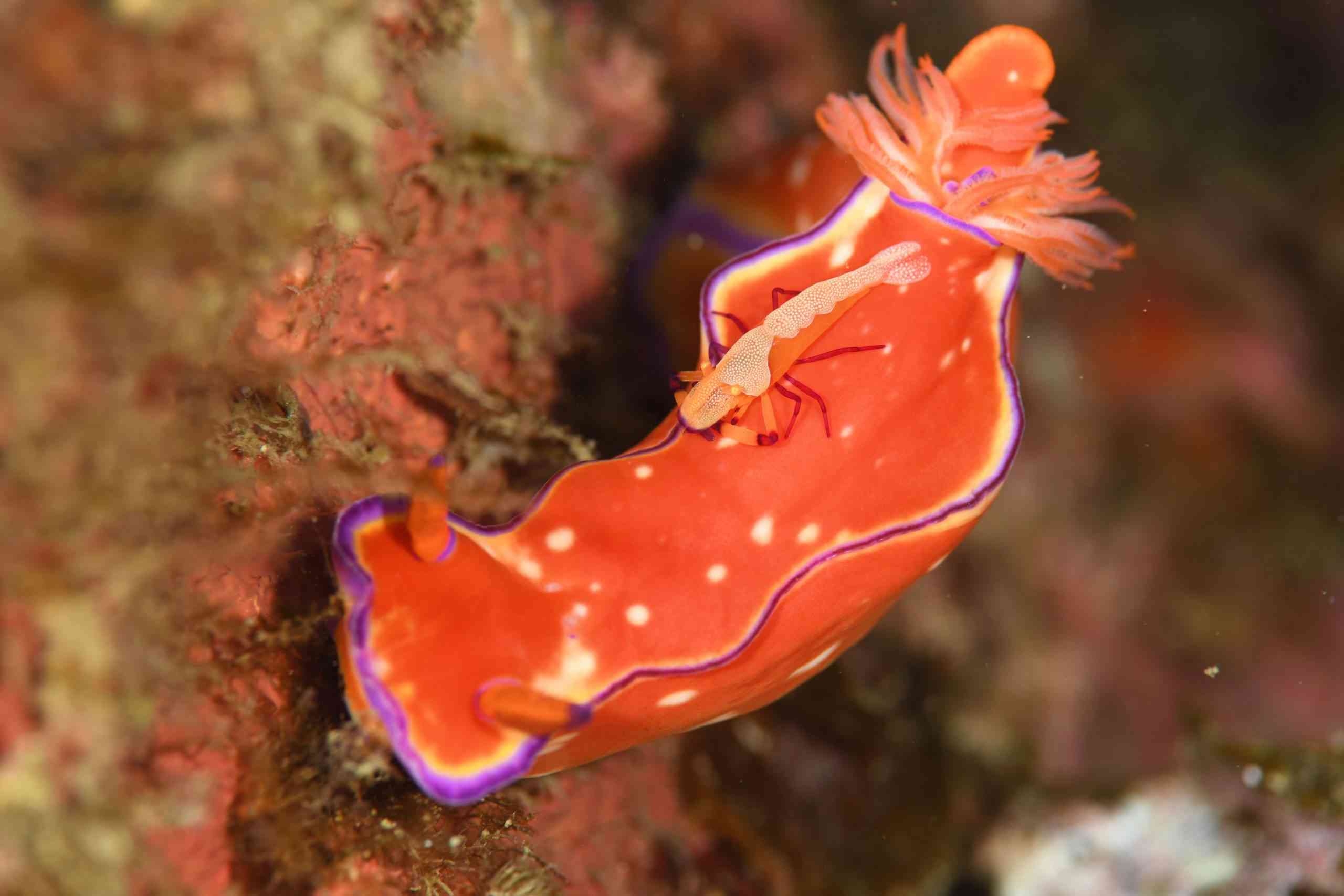 私が今日いちばん、これぞ!と思ったのがこちら。ヒトデヤドリエビ、の群れ(笑)。同じマンジュウヒトデに、どっさりと乗ってました。全部で10匹以上乗ってたので、全員一緒に撮ろうと思っても難しかったです。