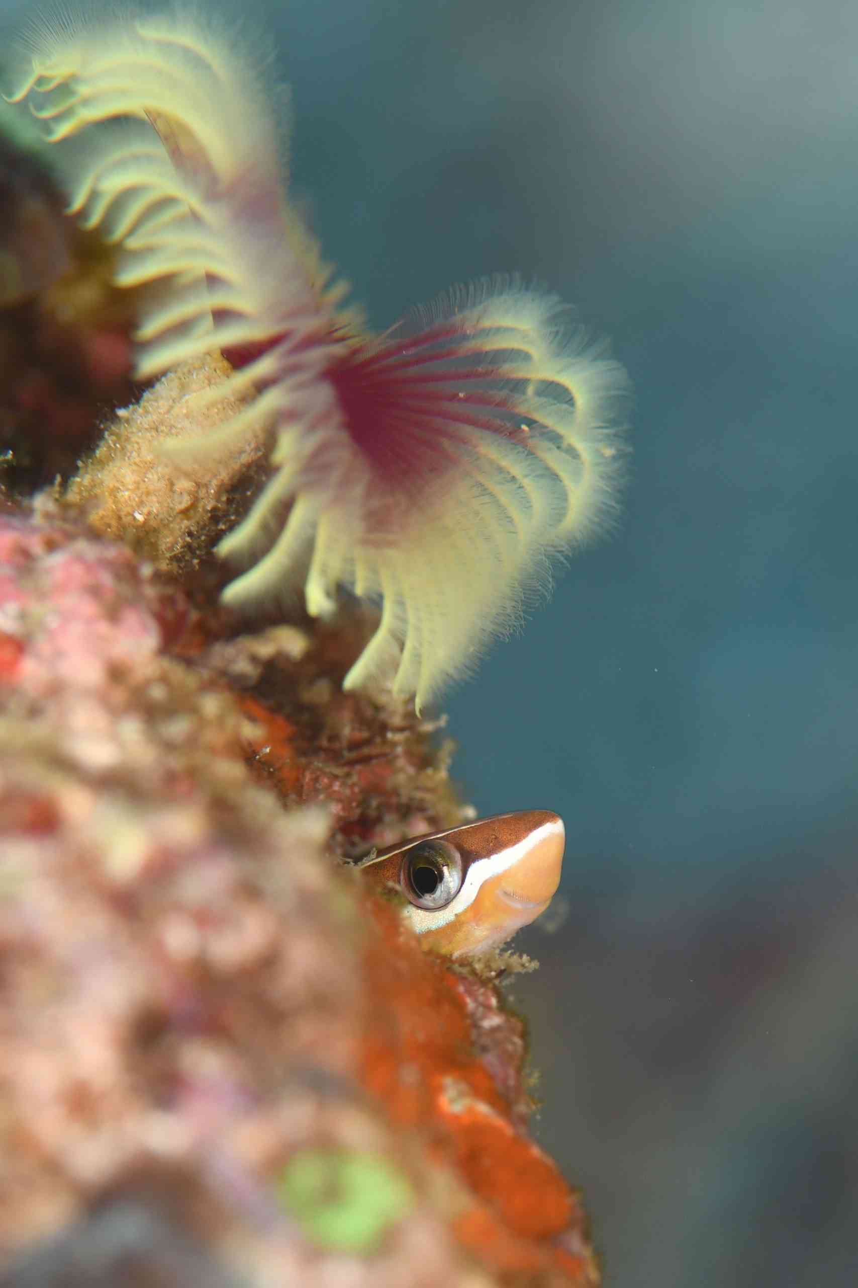 そんなみーちゃんさんと打ち合わせてた、住崎の深場での狙い。まずは、キクチカニダマシ。カイメンの隙間にいて、写真は撮りにくいですが、体色がキレイで、目がかわいい。