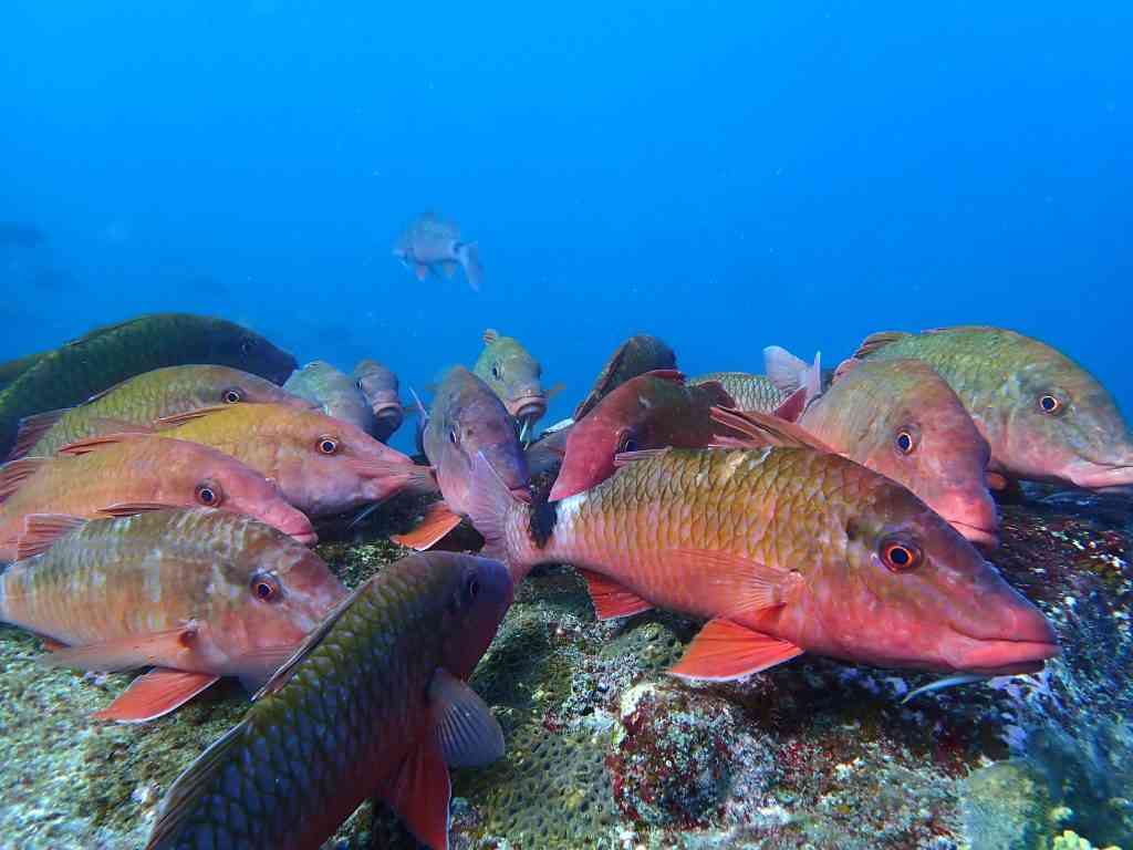 まずは、「今なにが見どころ?」って言われたら、まずはこちらです。ホウライヒメジ群れ。よく、根の上でひしめきあって休憩をしています。次から次へ仲間たちが同じところに休憩しに来るので、「おい、せまいやろーが!」「もっとそっち行ってーや!」というやり取りが聞こえてきそうなほどに、ぎゅうぎゅうになっています。