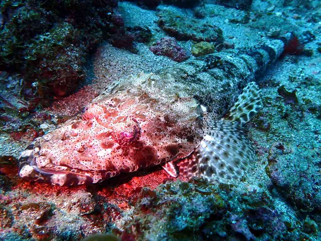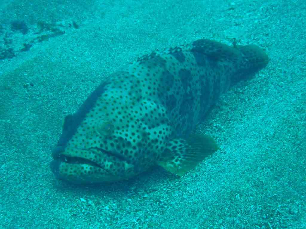 そして最後は、水温が下がって、あまり動きたくない南方種、チャイロマルハタ。光がしっかりと当たると、茶色っぽい体に、特徴的な赤いテンテンがついているのがわかるんですが。