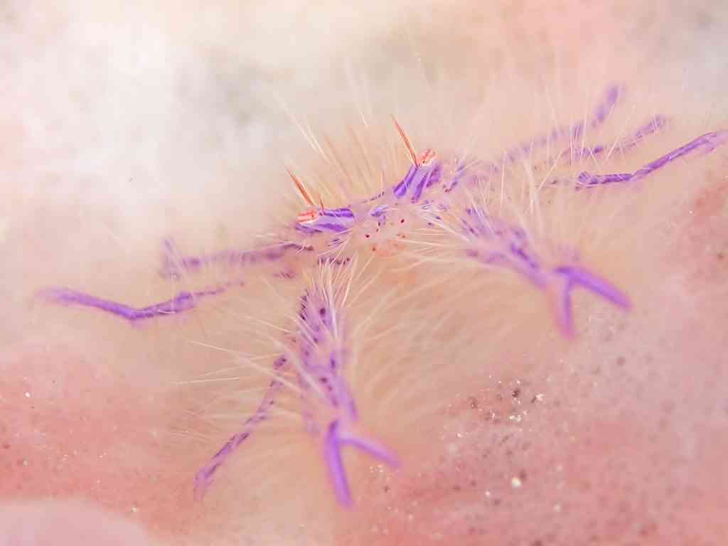 そして最後は、深場も深場、水深26mに住む、ピンクスクワットロブスター!!和名が、サクラコシオリエビです。薄紫の上品な色合いに、細い毛がふさふさで、めっちゃかわいいやつ!エンリッチご利用の方で、エア持ちに自信があって、少し遠くまで行かないといけないので泳ぎにも自信のあるメンバーがそろったら、ぜひ見に行きましょう!!でも、頑張って行ってみても、隠れてたら全然見られない日もあるし、見つかっても狭いビロビロの中に住んでいるので、ストロボが当たらない、など難点がいくつかある、いろんな意味で、ちょっと難しい被写体です(笑)