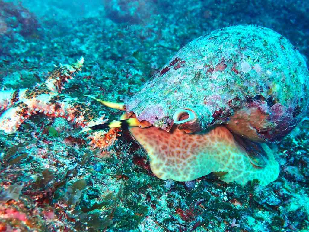 お次は、ホラガイがヒトデを捕食するシーン。ゆっくりに見えて、ホラガイがヒトデを追うスピードの速いこと。しっかりと捕まえてバクバクと食べていました。ヒトデは、じわじわと自分の体を食べられて、どんな気持ちなのだろう?やや不憫。