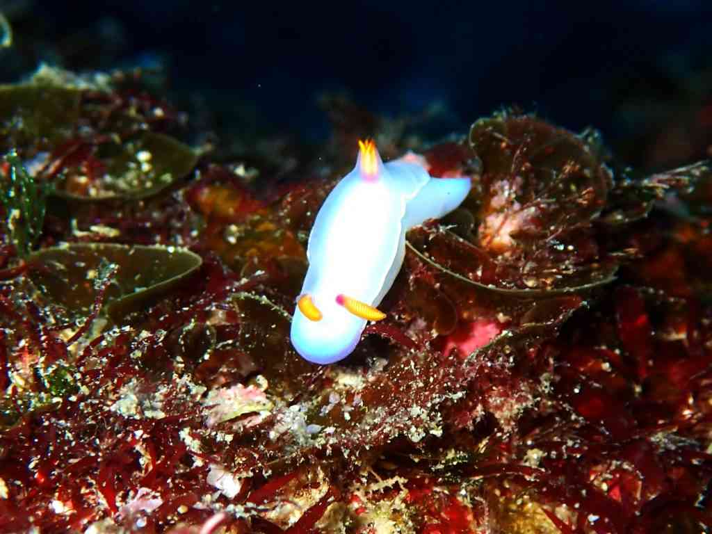 生き物のお写真は、やいちゃんさんからお借りしました。まずは、ウミウシ界の、個人的No.1アイドル、ゾウゲイロウミウシ。真っ白でありながら、真っ白でない、この透き通るような美しい色。ふちに向かってわずかに見える薄紫の色彩と、黄色とピンクの触覚&二次鰓(エラ)。たまたま通りがかったところの下にいました!明日も会えたら、ぜひ皆さんにご紹介したいです。