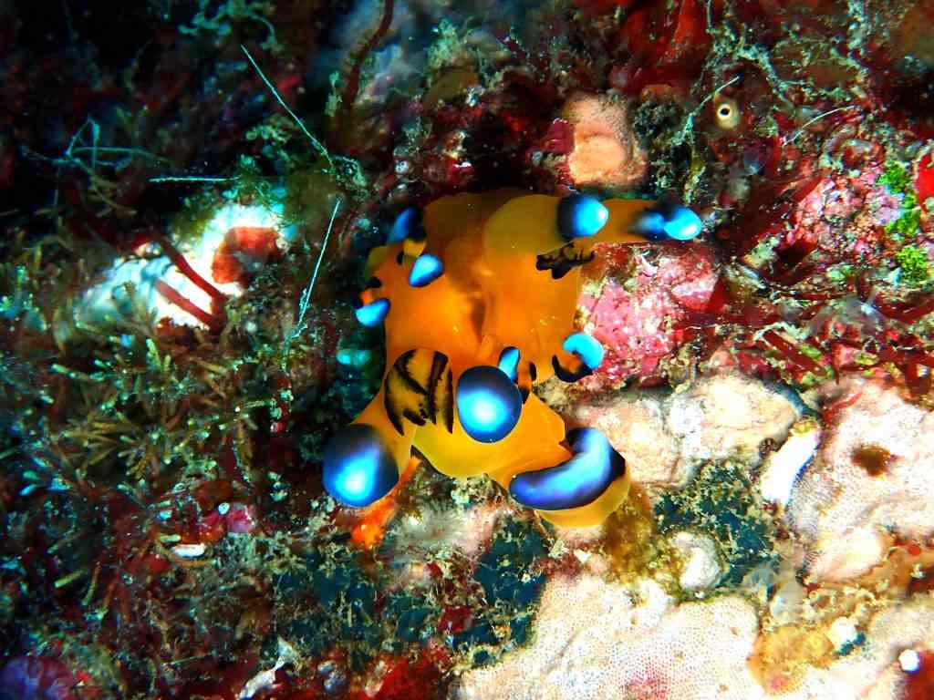 ピカチュウこと、ウデフリツノザヤウミウシは、交接を始めたところを撮っていただきました。お互いの体の右側から、交接器を出し、くっつけあっています。ウミウシって、食べるか、交接するか、産卵するか、しか脳がないと聞いたことがありますが、「なんて平和な生き方なんだ・・・!」と、ある意味尊敬です。攻撃したり、いじめたり、けんかしたり、そういうことがないのが、どれだけ幸せな生き方か。「おい、お前ばっかり交接してずるいぞ!」「おいおい、ここのコケムシ(ごはん)は全部オレのやぞ、お前はどっか行け!」とか、そういうことすら、有るのか無いのか・・・そもそも雌雄同体なので、「俺」とかいう概念も無いのか!不思議な生き物です。