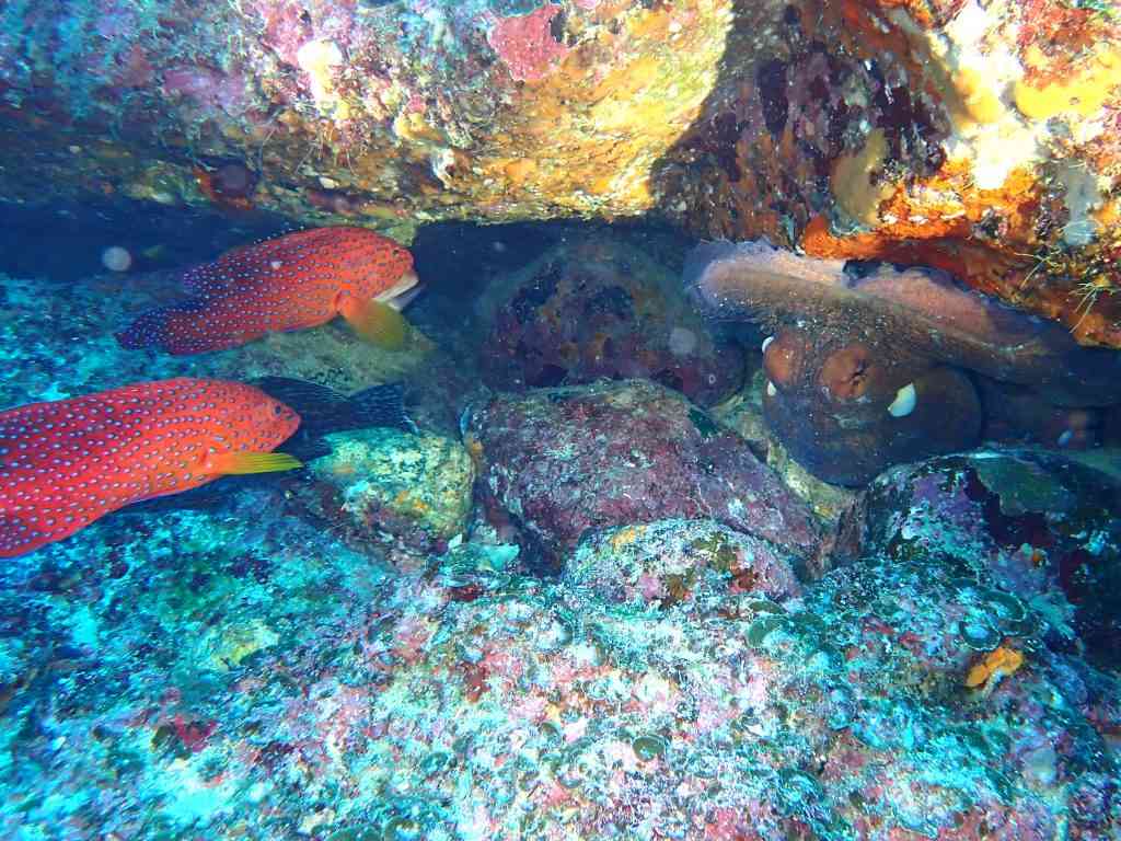 これはほかのタコかな?隙間の狭いところにタコが入りこみ、「中にいた小魚たちがびっくりして出てきたら食べてやろ~」という感じで、狭いところの端(はた)で、ハタ系のお魚たちが待ち構えています。よくいるのが、オオモンハタ、アカハタ、そしてこのお写真に写っているのがユカタハタです。皆さん、初めてこの光景を見られると「ハタがタコを狙っている」と思われがちなんですが、そういうわけではないんですよ~(*^^*)