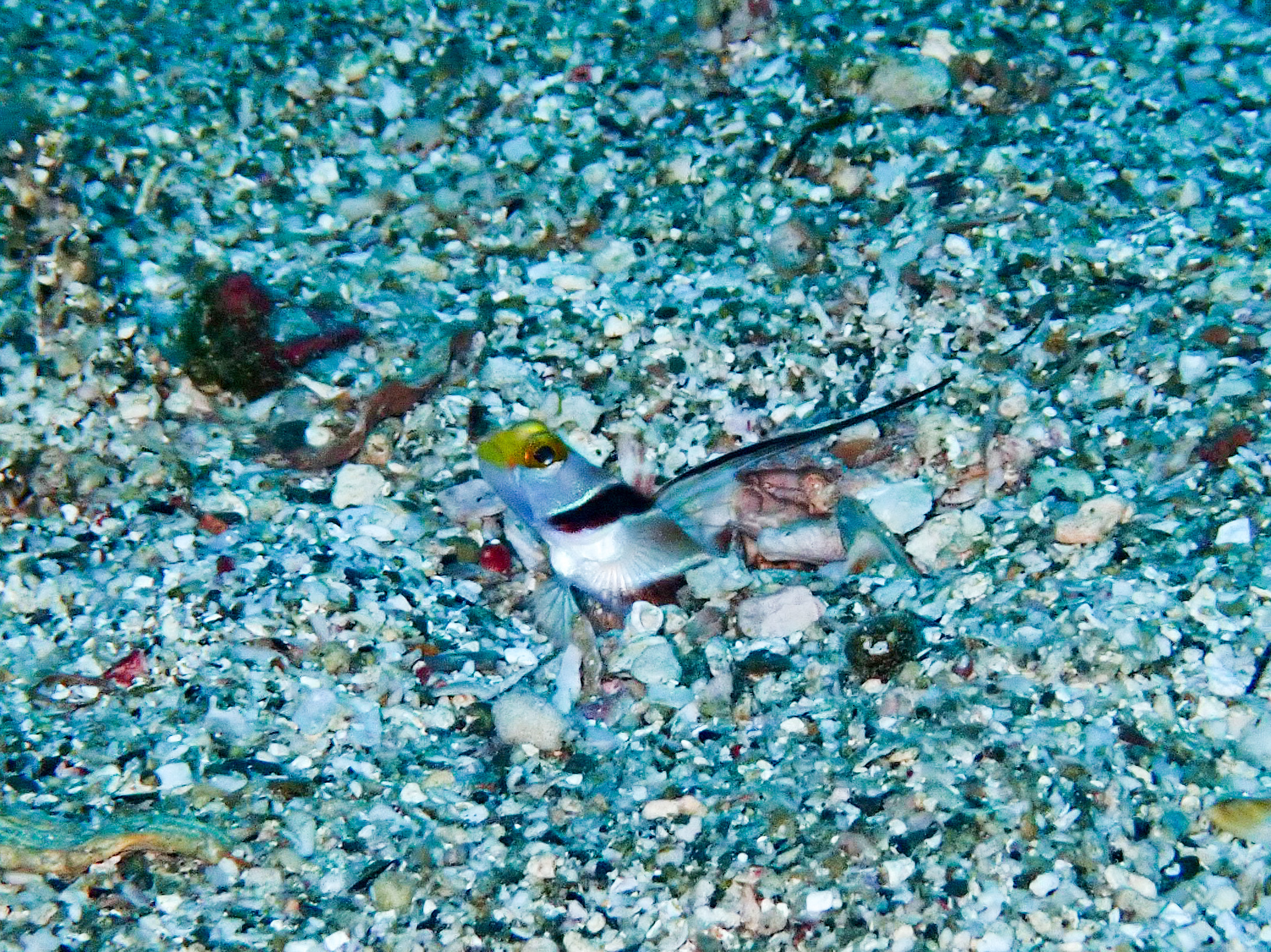 久々に行った深場の砂地で、アオヤガラの幼魚。お写真では伝わりにくいですが、ちょうど鉛筆ほどの大きさで、かわいかったです。