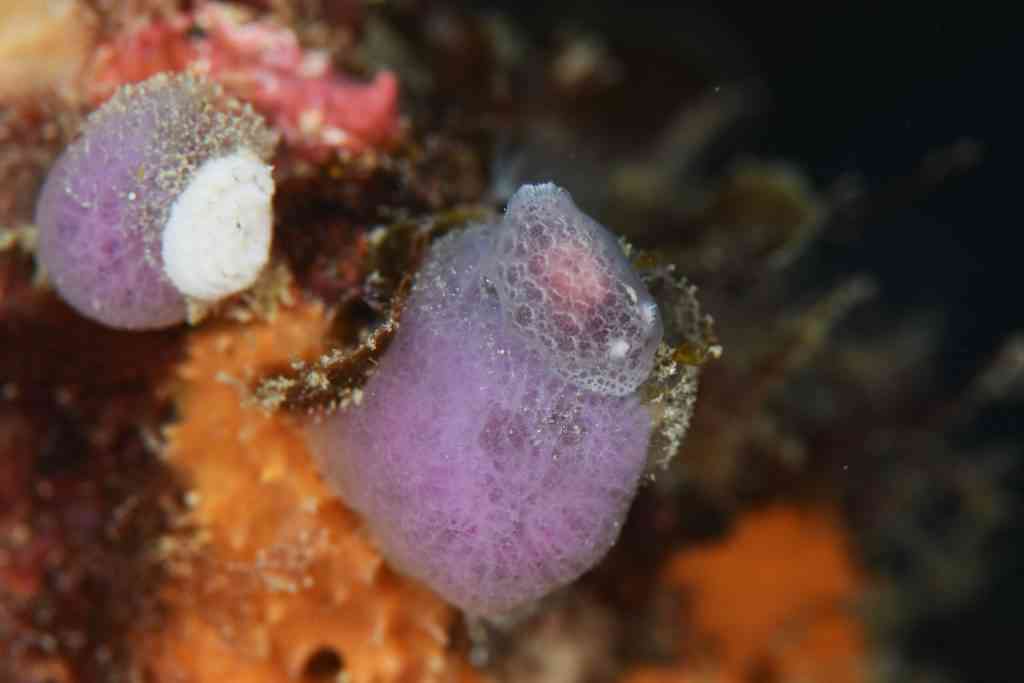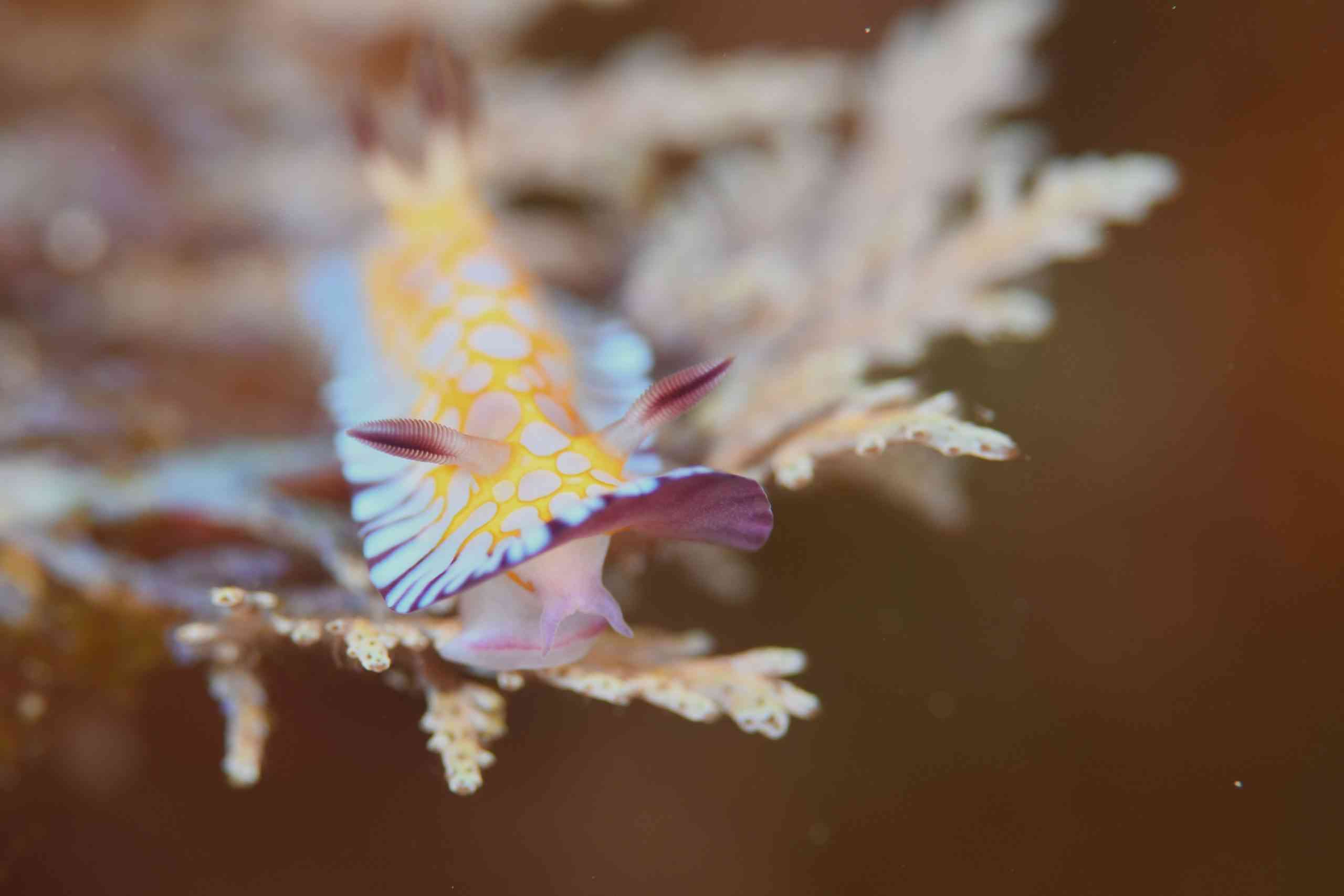 生き物のお写真は、やいちゃんさんからお借りしました。まずは、ウミウシ界の、個人的No.1アイドル、ゾウゲイロウミウシ。真っ白でありながら、真っ白でない、この透き通るような美しい色。ふちに向かってわずかに見える薄紫の色彩と、黄色とピンクの触覚&二次鰓(エラ)。たまたま通りがかったところの下にいました!明日も会えたら、ぜひ皆さんにご紹介したいです。