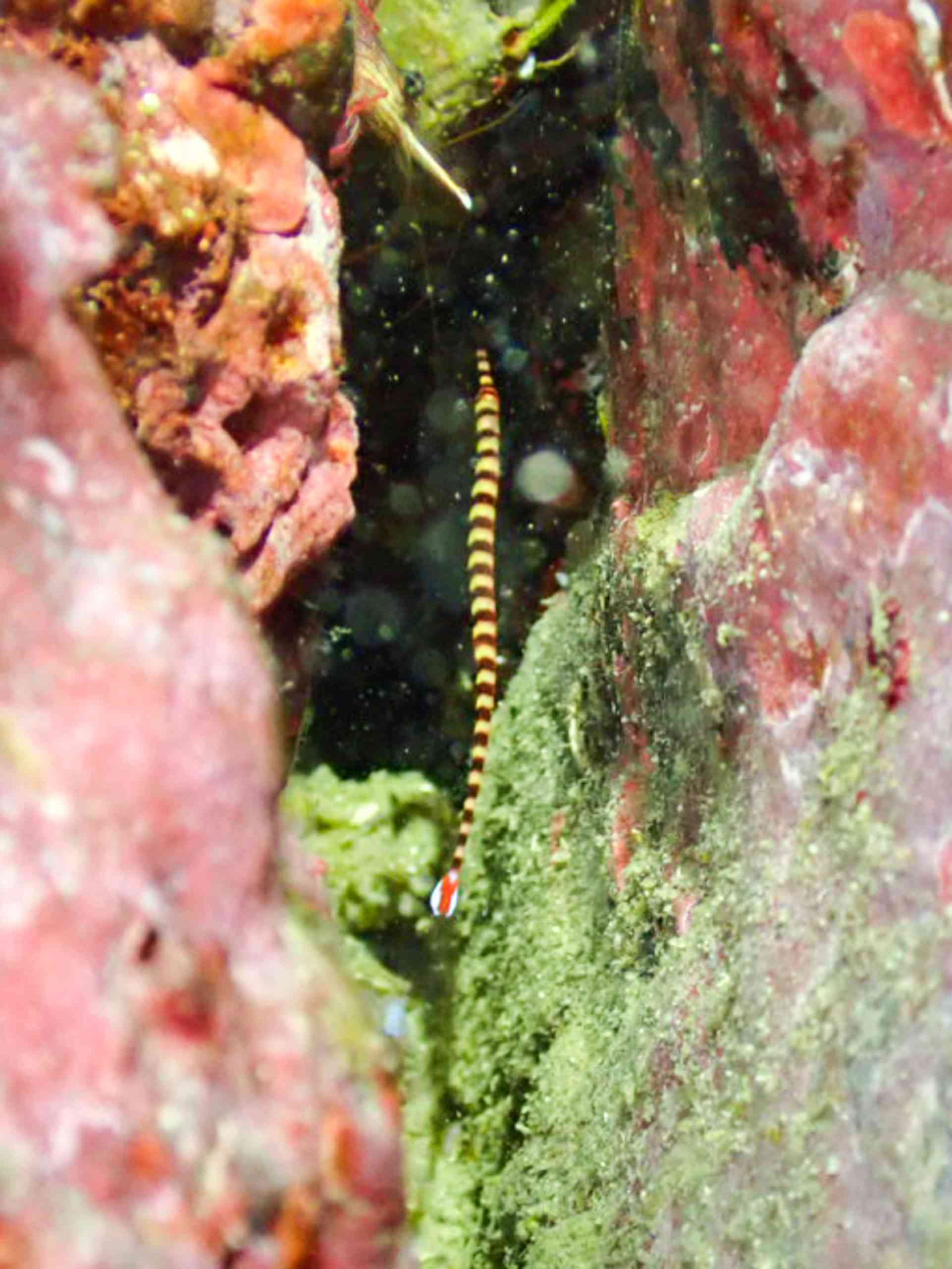 こちらは生態観察したワンシーン。お顔が興奮して真っ赤に写っているのは、ホウライヒメジ。そのホウライヒメジの体についた小さな寄生虫や古い角質みたいなものを食べてクリーニングしてくれているのが、ホンソメワケベラ。細長い体が特徴です。