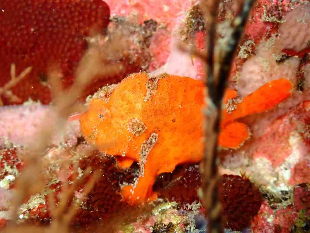 そして、こちら、珍しい、オレンジ一色、隈取り模様の無い、クマドリカエルアンコウではないかとささやかれているカエルアンコウ。すごく隠れ上手な子で、会える日・会えない日ありますが、すごくきれいな子です。