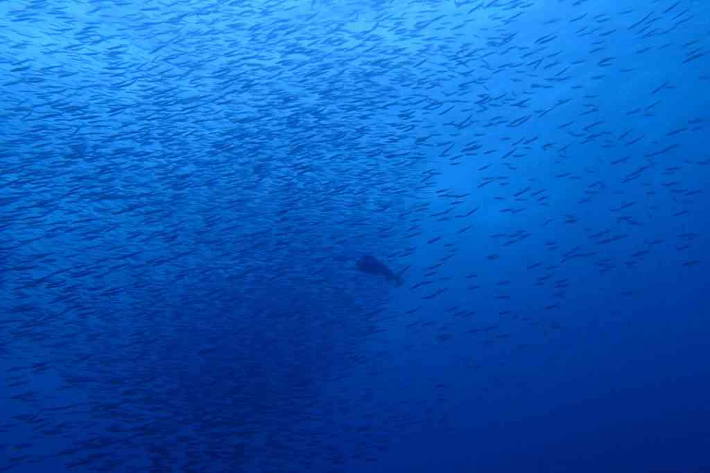 でも、お魚たちからも私たちのことがあまり見えていないのか、巨大なヒレナガカンパチの群れやタカサゴの大群など、近くで観察する機会に恵まれました。ヒレナガカンパチは1mを優に超える大きさですが、透視度が悪くあまり見えていないので、近くでその存在を認知した時にはかなりビックリしちゃうほどでした!