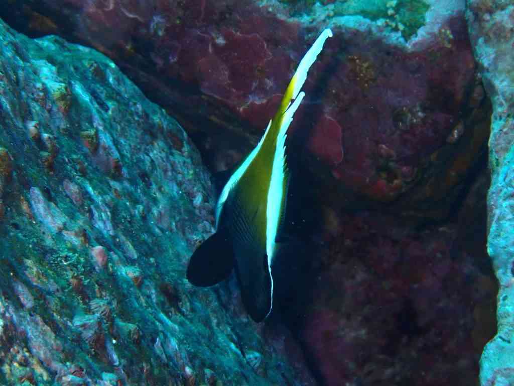 そして、最後は、こちら、フウライチョウチョウオの幼魚。まだ小柄ながら、立派に体のラインがくっきり、そして尾びれの先端と、尾びれの付け根と、目のところの3か所に黒いラインが入っている子です。この子も串本エリアではあまり見かけないなぁ~!