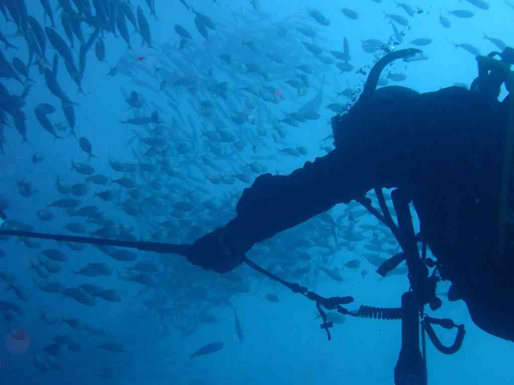お約束のアジの群れ、に突入する「ごま」さんのご主人。ゴープロ用の長い棒が、魚に近づけてうらやましいですね!